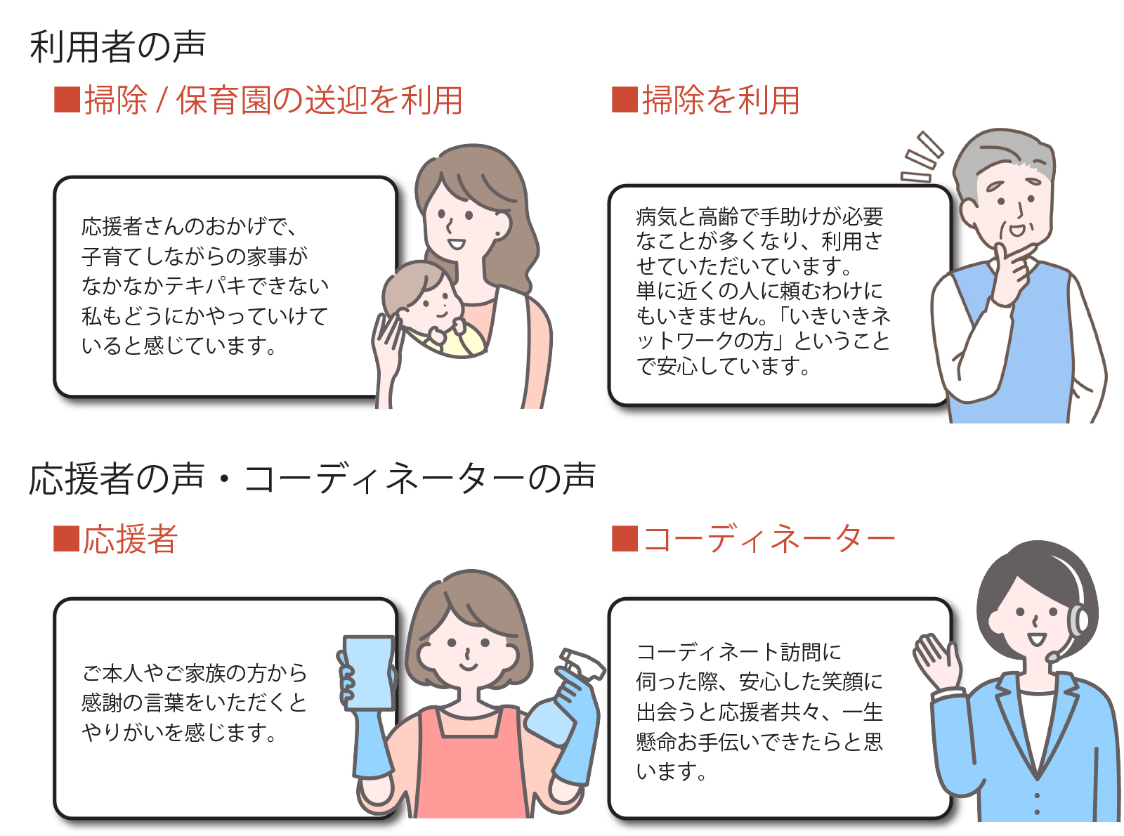 | ・掃除(部屋・台所・風呂・トイレ等)、洗濯、買い物、食事づくり等の家事援助 ・子どもの見守り、送迎等(子どものお世話は生後一ヶ月からとなります) ・ご高齢等でお困りの方の病院や外出時の付添い、お話し相手等 (身体介助、介護、専門的な知識や技術を必要とする活動はお受けできません) ※応援者が見つからない場合はお断りすることがあります。 ※活動開始までにお時間をいただく場合があります。 |