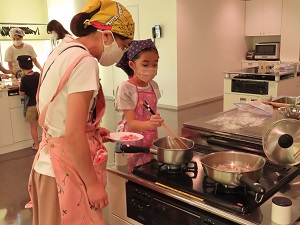 夏休みということもあって、定員の倍以上のお申込みをいただいた人気の企画となりました。ぱる★てらすの5階調理室にお集まりいただき、講師の動きを見ながら一緒に調理をしていきます。