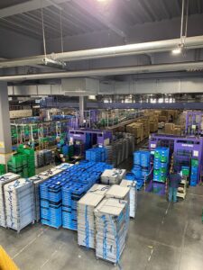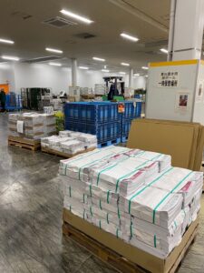 慣れた手つきでカタログをさばく作業員さんたち、フォークリフトが動く作業場所、湿度管理がされているペーパー類のライン、ものすごい速さでカタログが個人別に丁合されるライン、はじめて目にする光景は驚きの連続であり、この様な過程を経て私たちの手元に届けられていることを実感しました。