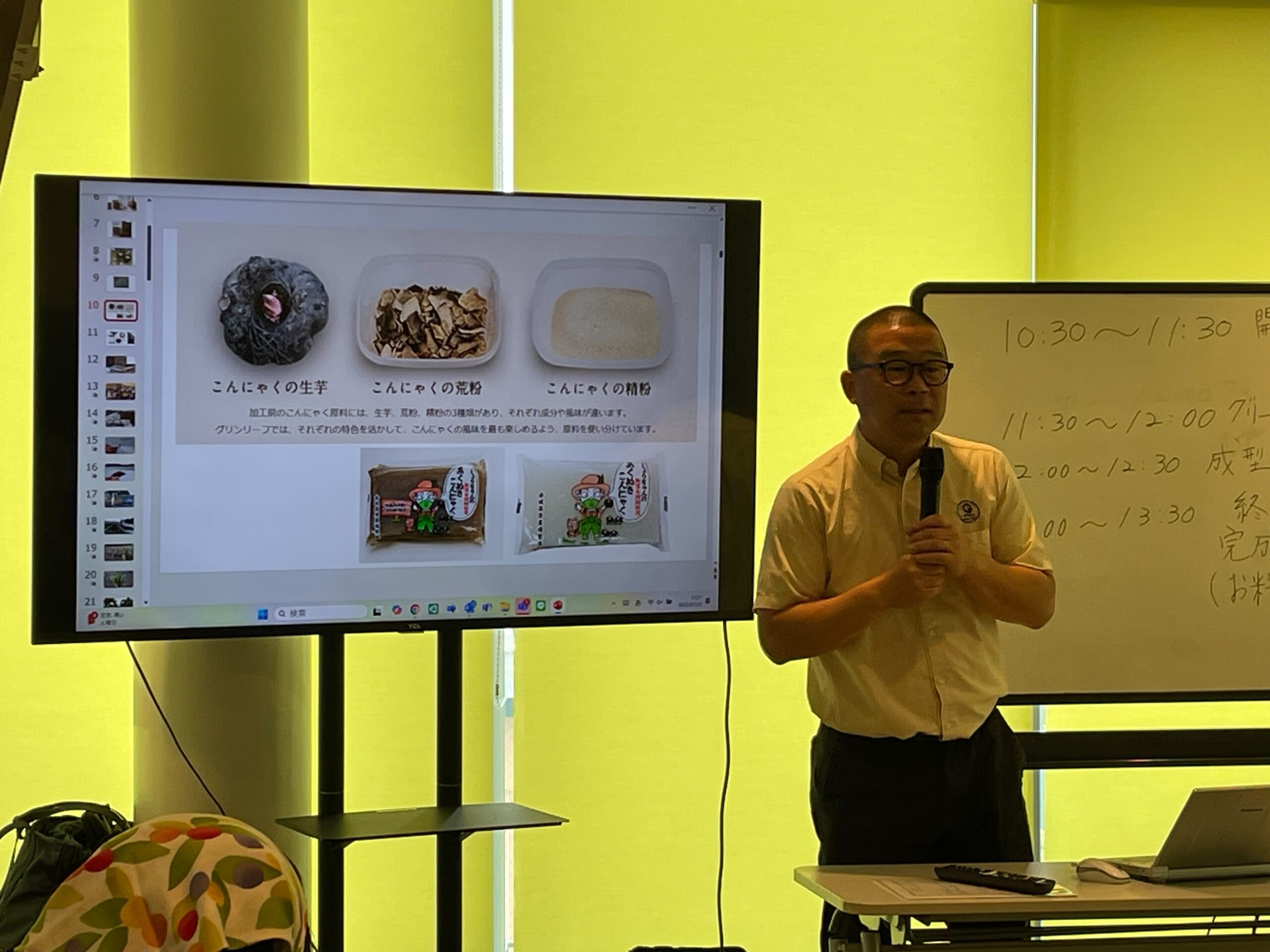 グリーンリーフ(株)の方が前々日に収穫して蒸した「こんにゃく芋」から作る本格的なものでした。また、育てている野菜のこと、こんにゃく芋は育てるのに3年かかること、新しいお料理セットの取り組みなど、興味深いお話もお聞きできました。