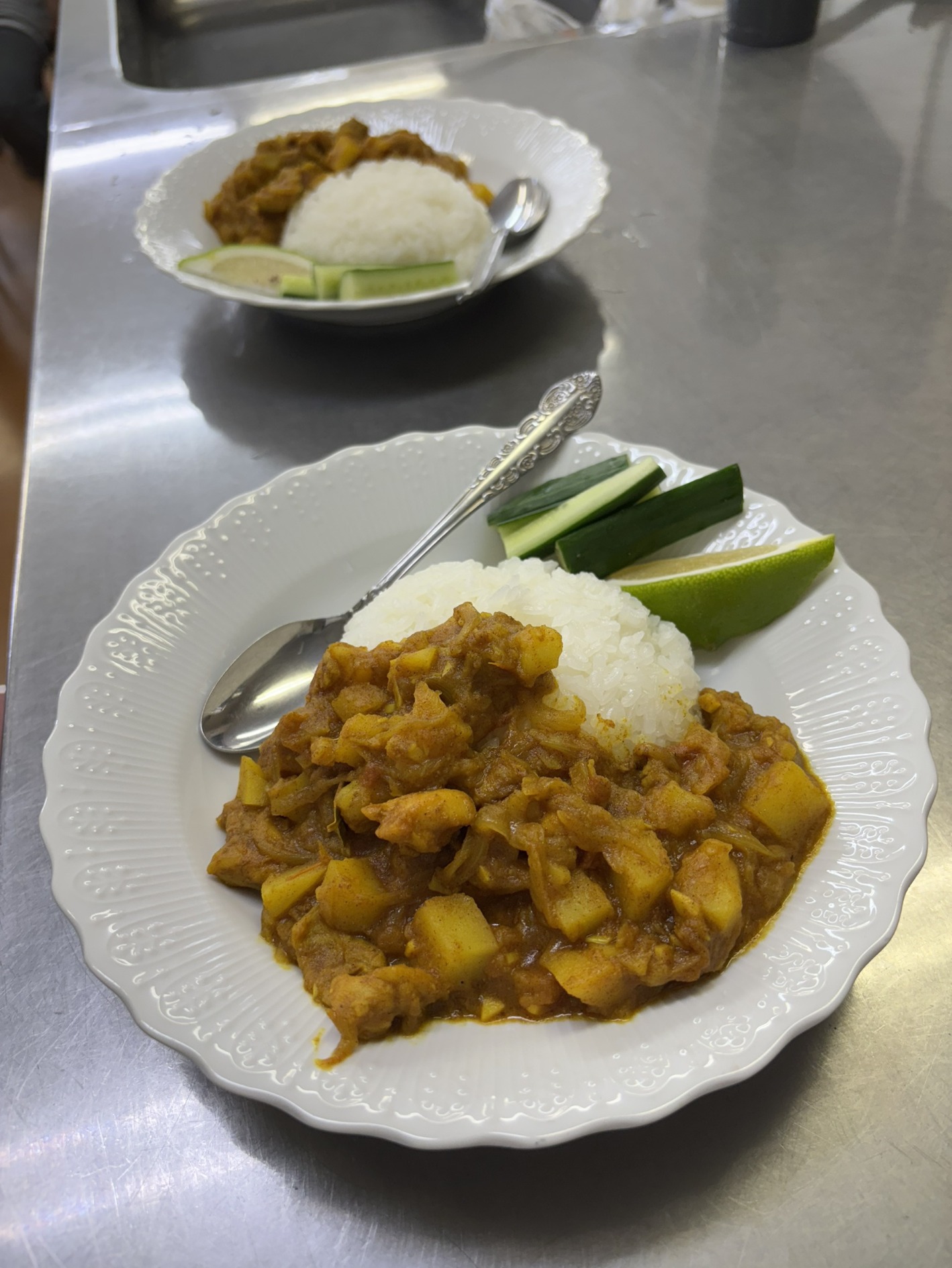 カレー作りでは、シャプラニール=市民による海外協力の会オリジナルのカレースパイスを使い、香り良く、程よい辛さのおいしいチキンカレーができました。