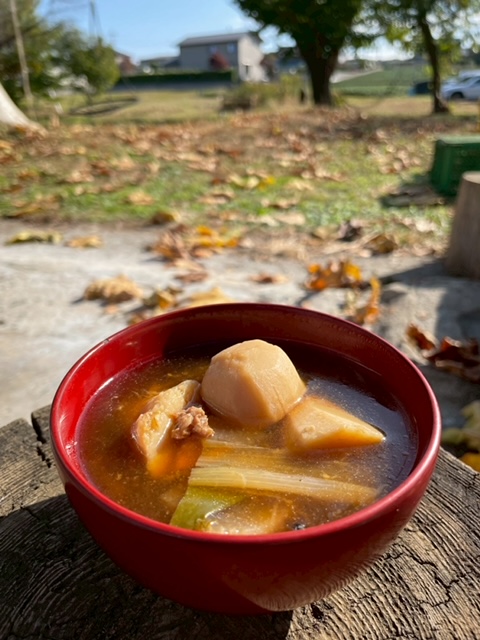 所沢の茶畑、畑道、市内循環バスの通る農道、ふるさと感あふれる景色の中、農薬や除草剤に頼らない健康な土からできた野菜、芋煮はとってもおいしかったです。