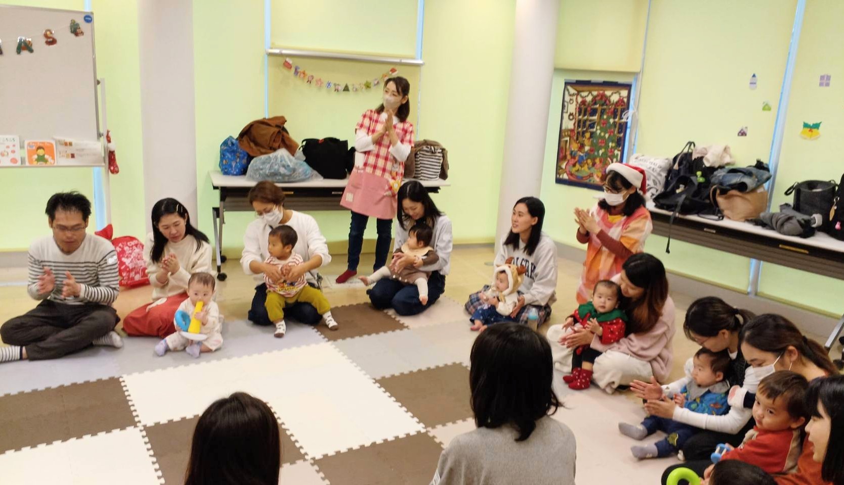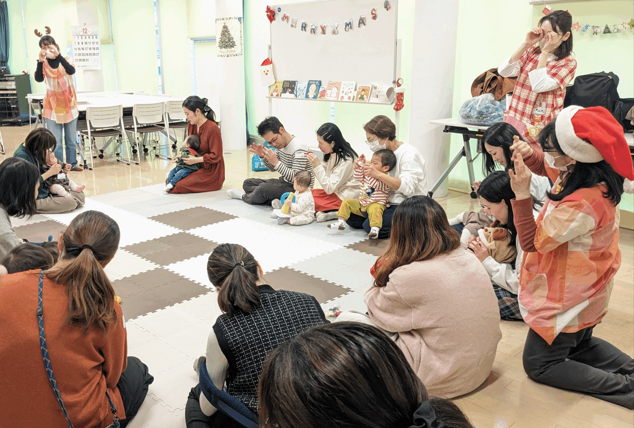 子育てサポーター(※)がクリスマスの装飾をした会場に、トナカイの帽子やクリスマスツリーのセーター、サンタさんの靴下などクリスマスパーティーにぴったりな装いをしたお子さんが加わりさらにクリスマス気分に♪