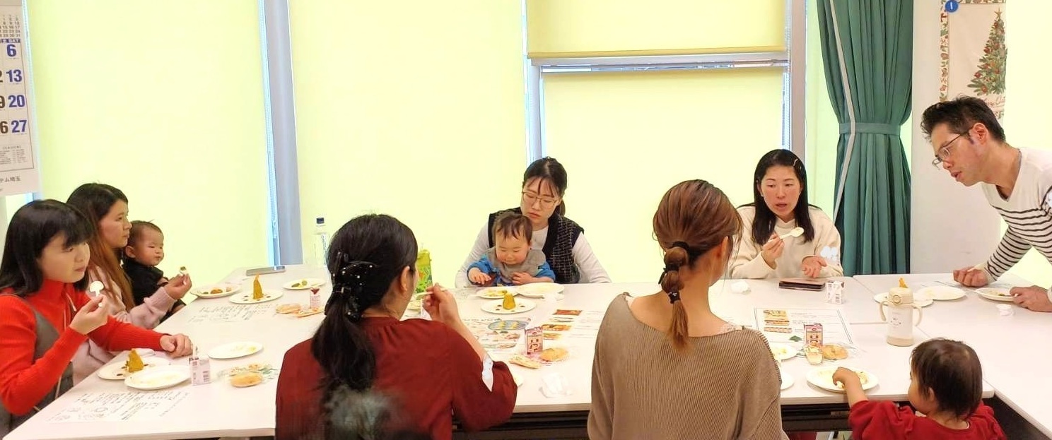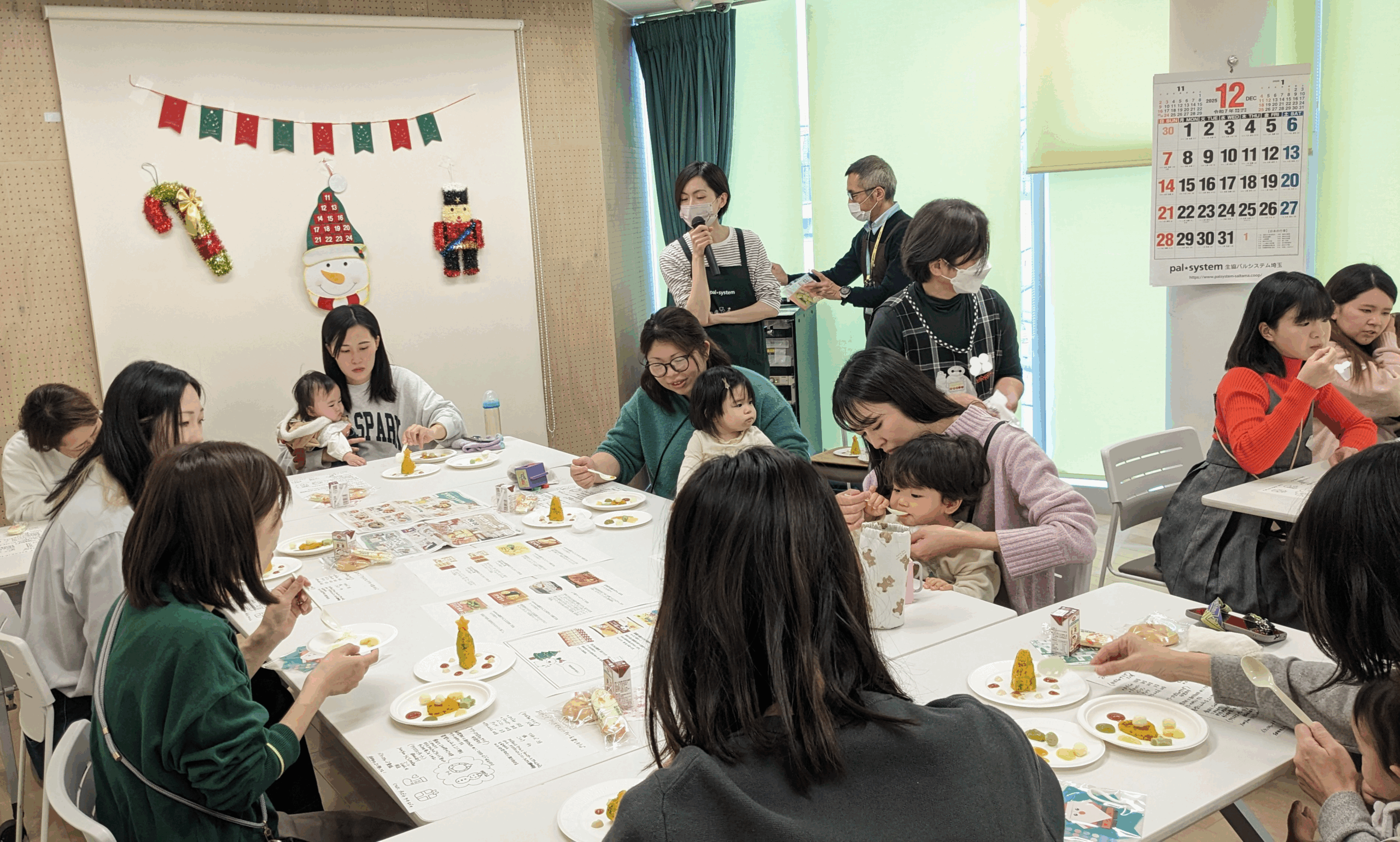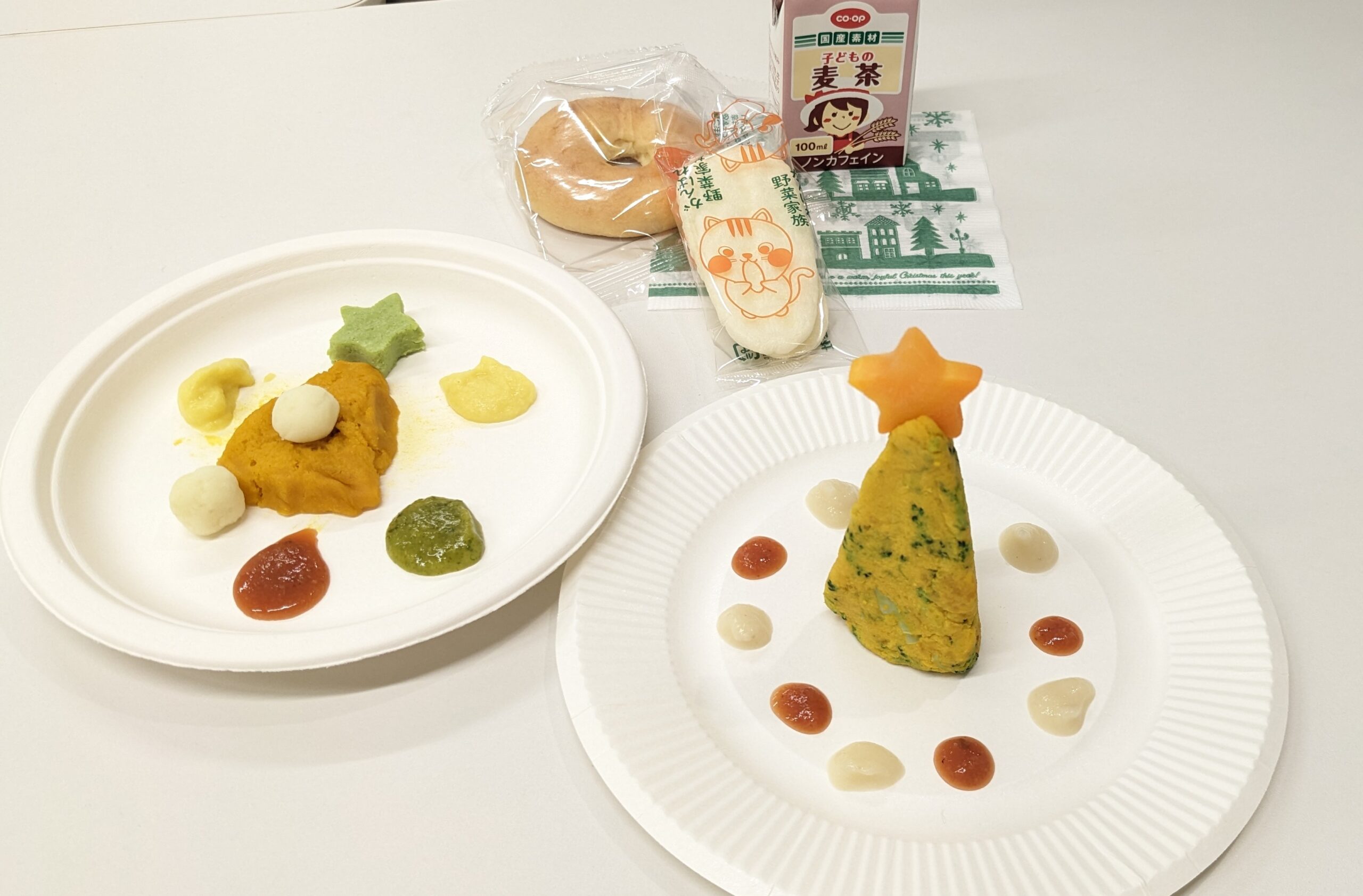 カボチャをメインにしたかわいいクリスマスツリーのアレンジにママたちの歓声が!クリスマスアレンジはパパママへのご提供としていましたが、パパママの判断でいつの間にか親子で美味しく食べられている姿も多くみられました。おもちゃで遊んでいる子は、子育てサポーターが見守りをし、パパママはゆっくり味わいながら食べることが出来ました。「離乳食・幼児食を食べてみることができて良かった」「こんなに簡単に作れるなら家でぜひ作りたい」などパパママから嬉しい感想を多く聞くことができました。