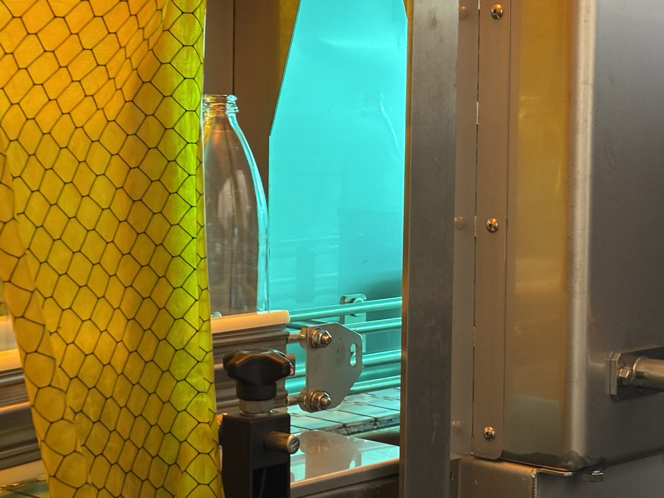 UV灯を使用した滅菌・びんを反転して内側の水滴を落とすという独自のラインも見ることができました。