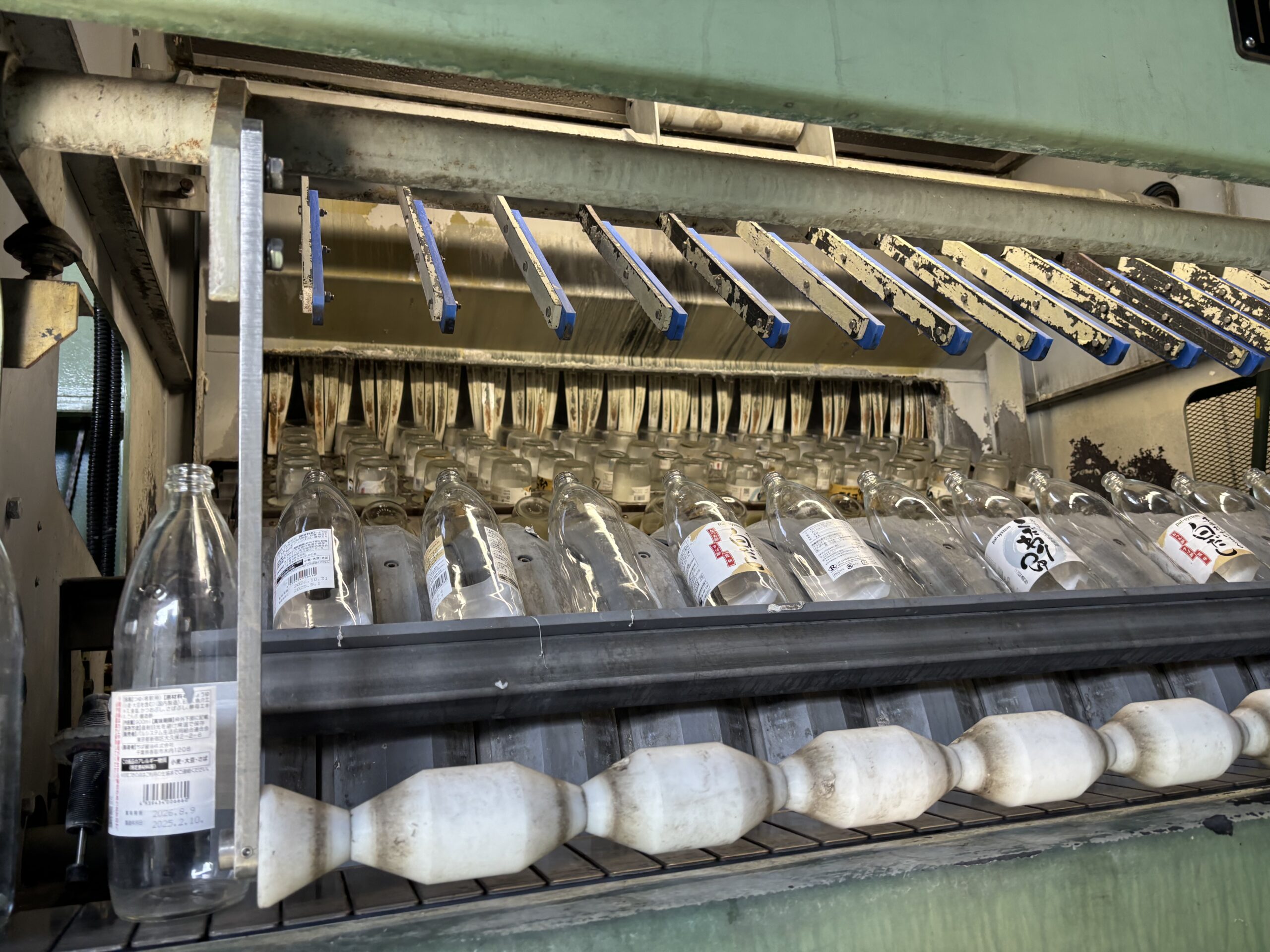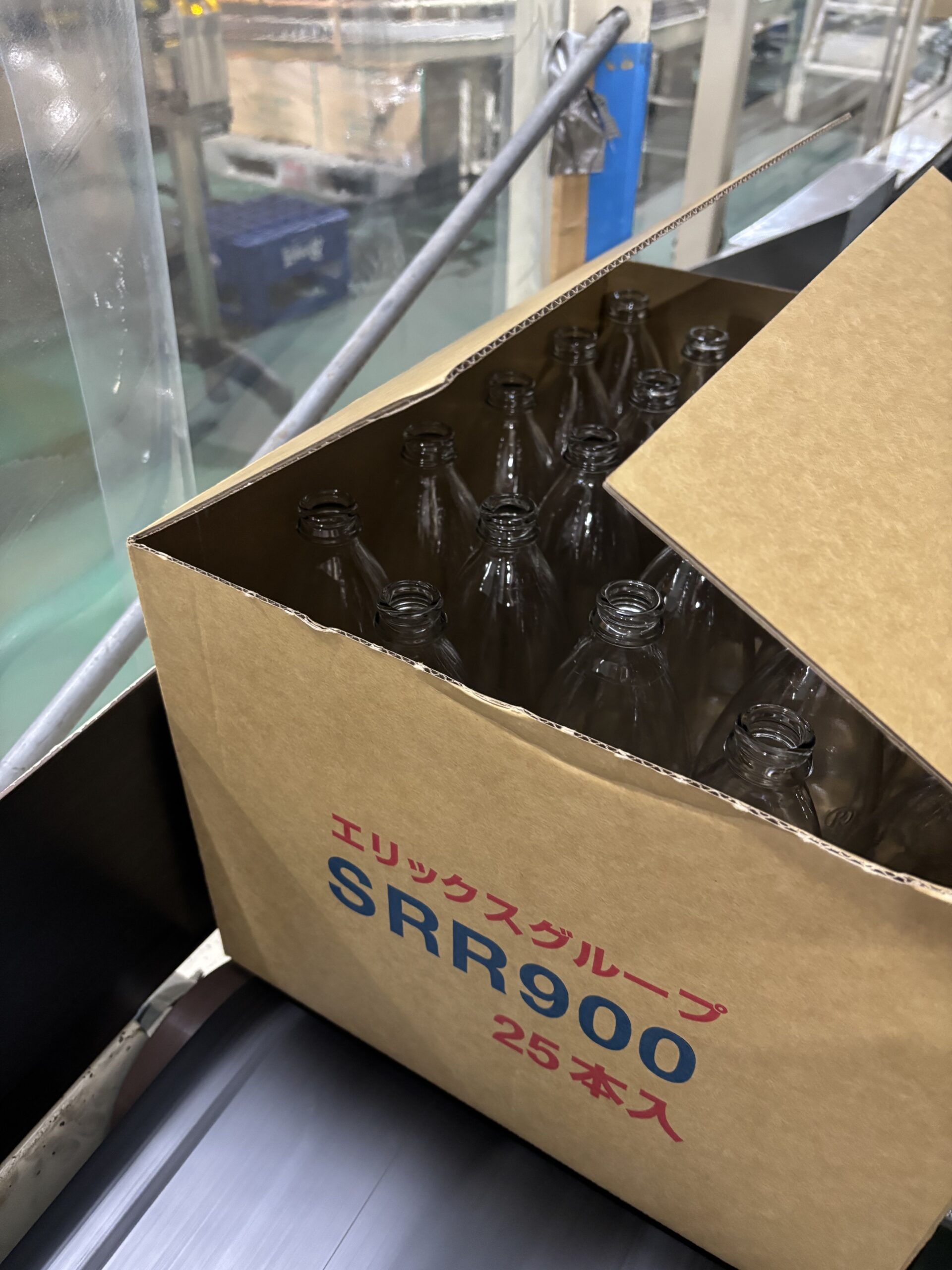 洗浄後のびんはカメラと目視で何重にもチェックされ、箱詰めされます(この箱も何回も使える通箱)。