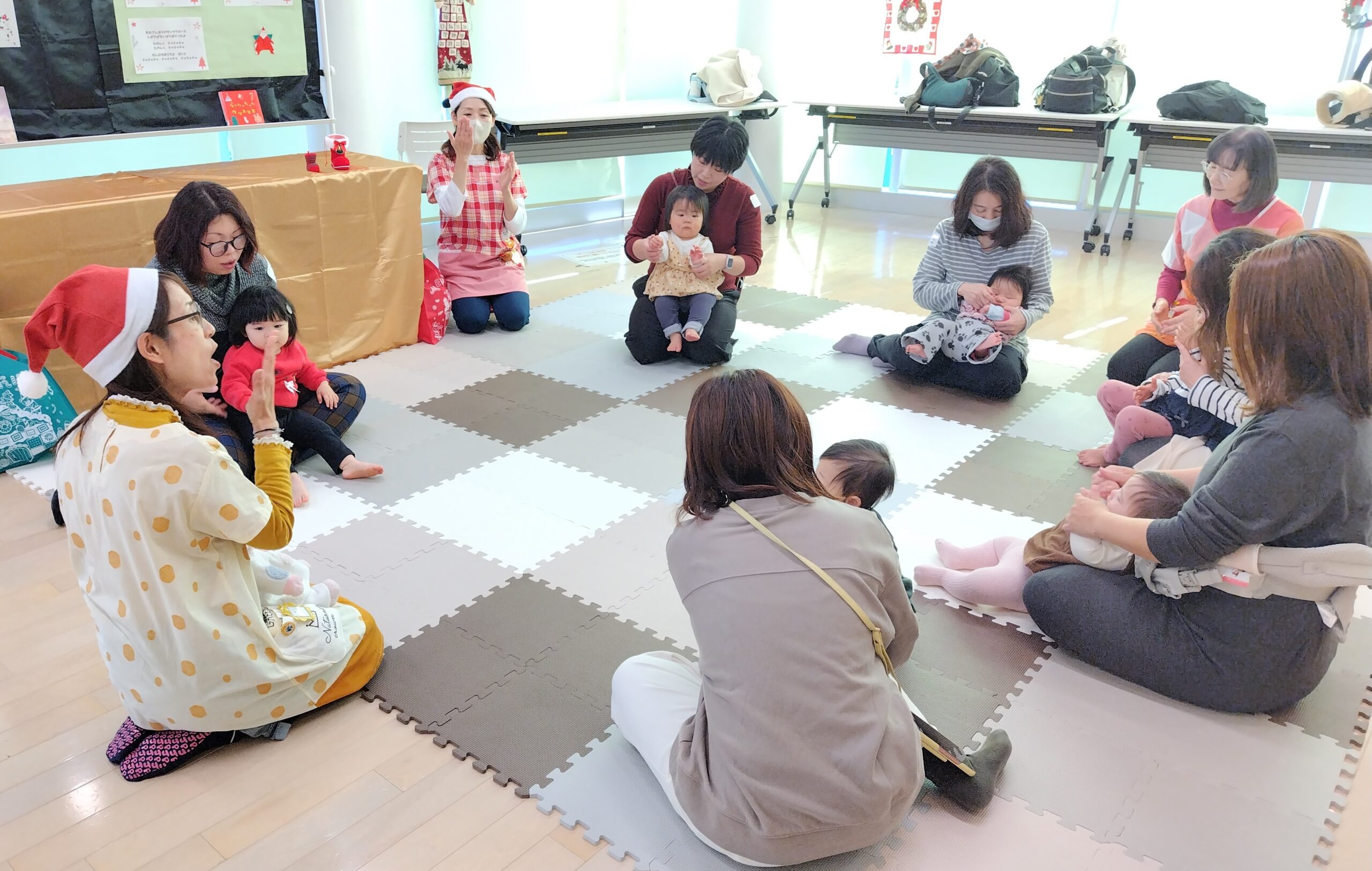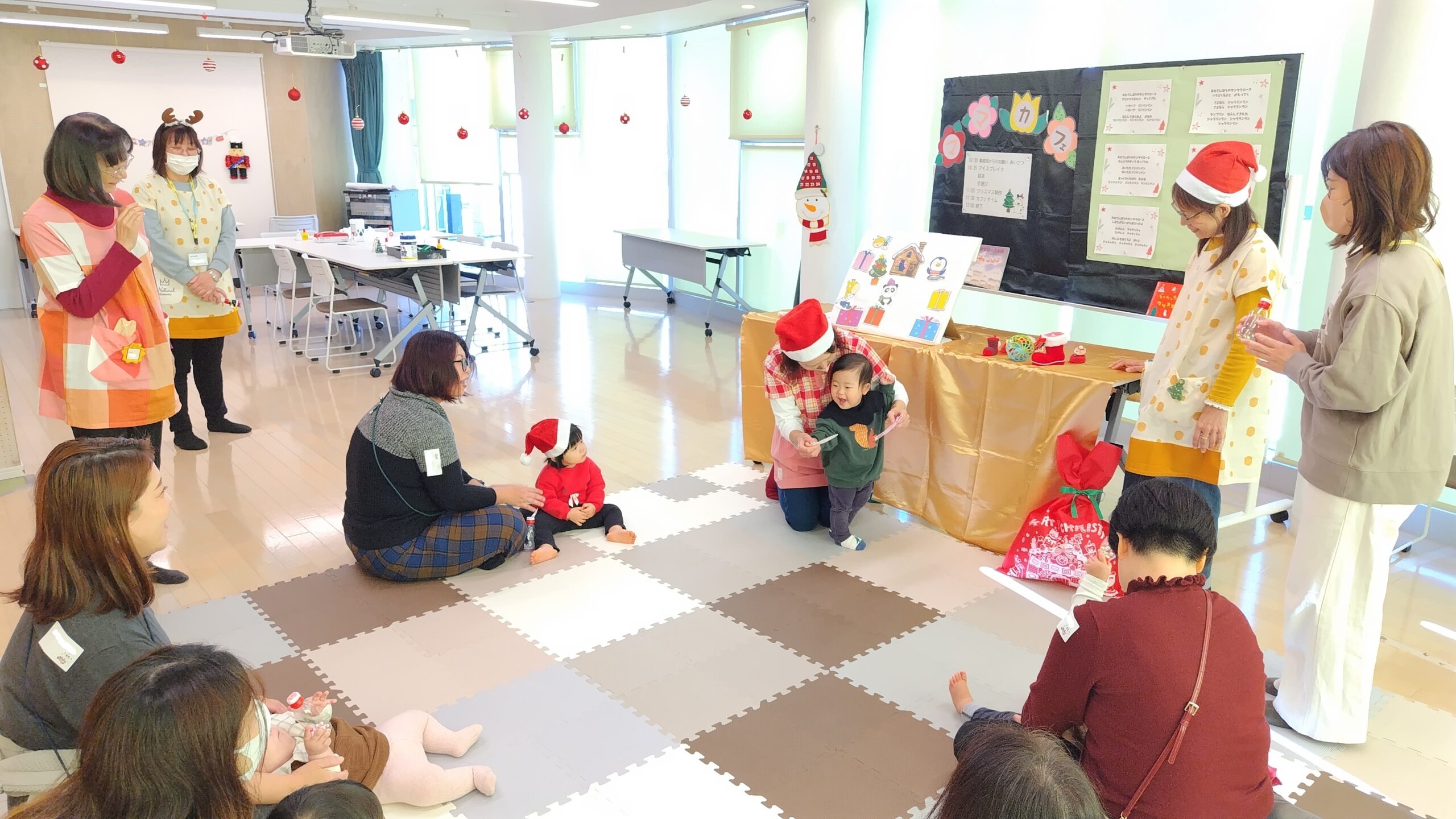 ふれあい遊びでは、わらべ歌をうたいながら親子でスキンシップをたくさん楽しんで、最後に「サンタッタ」をみんなで歌いながら踊りました。