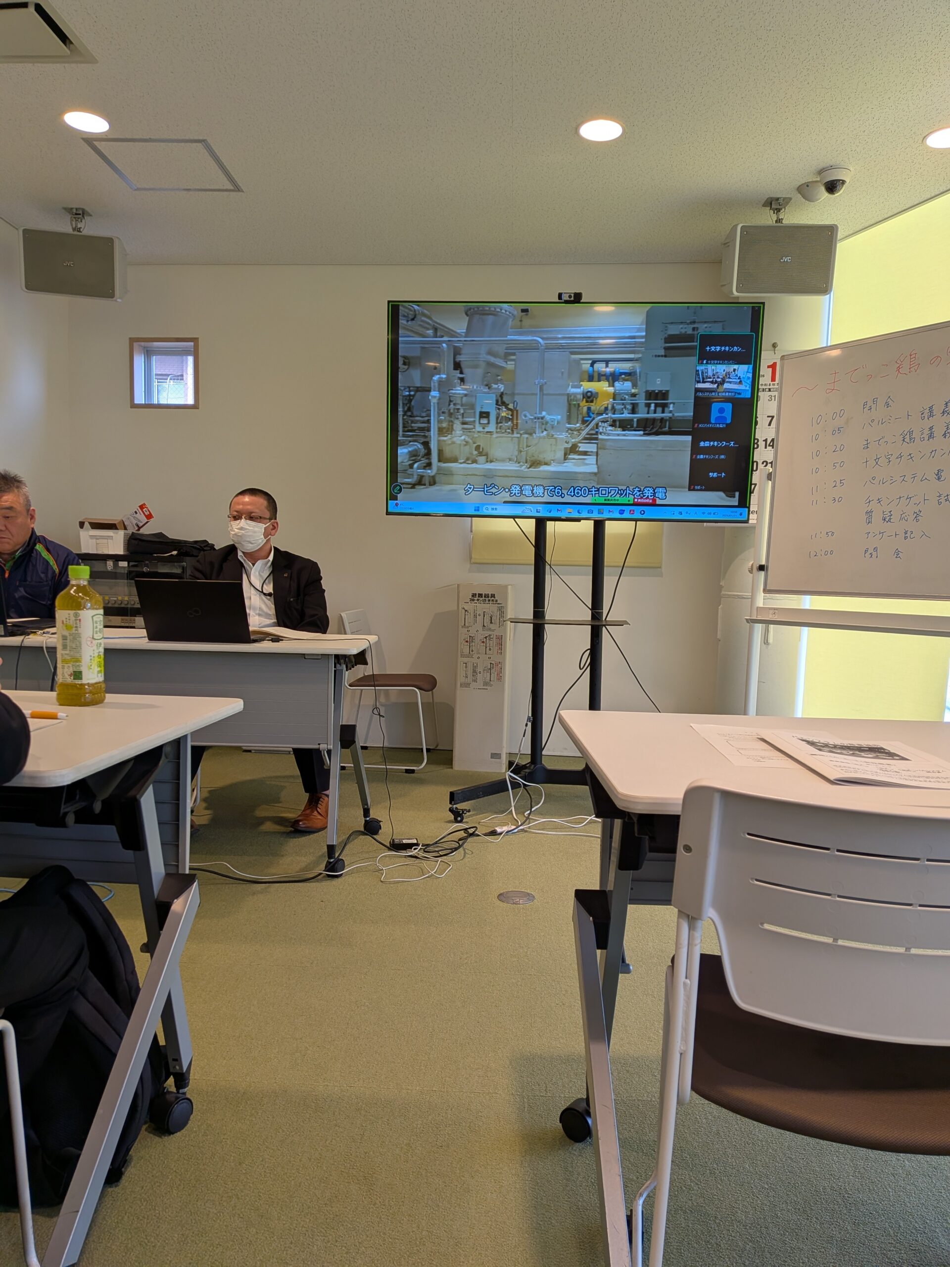 バイオマス発電講師の西舘さんからは鶏糞発電事業検討の経緯、プロジェクトの推移、発電事業開始後の変化について、現場中継も交えて分かりやすく講義をしていただきました。