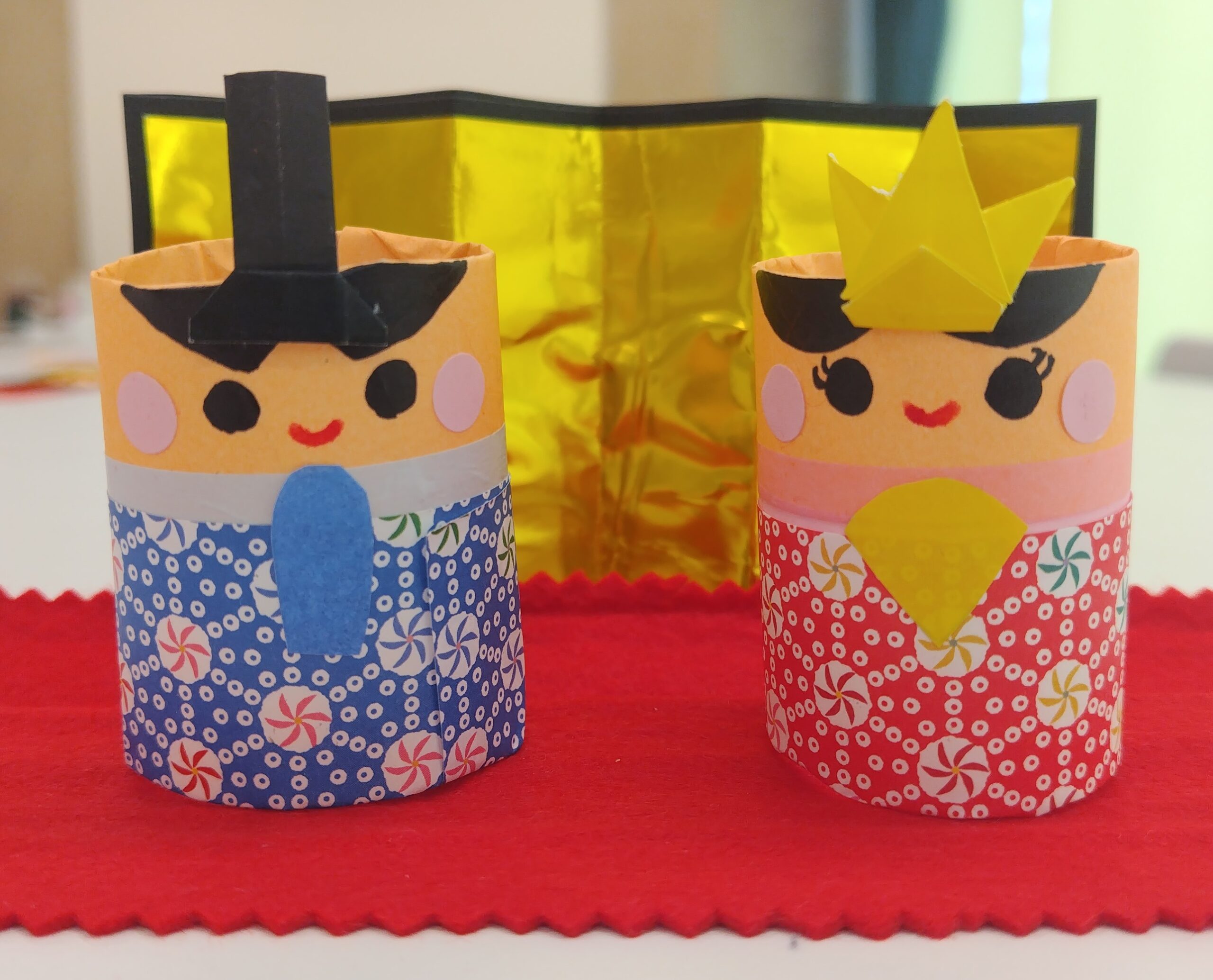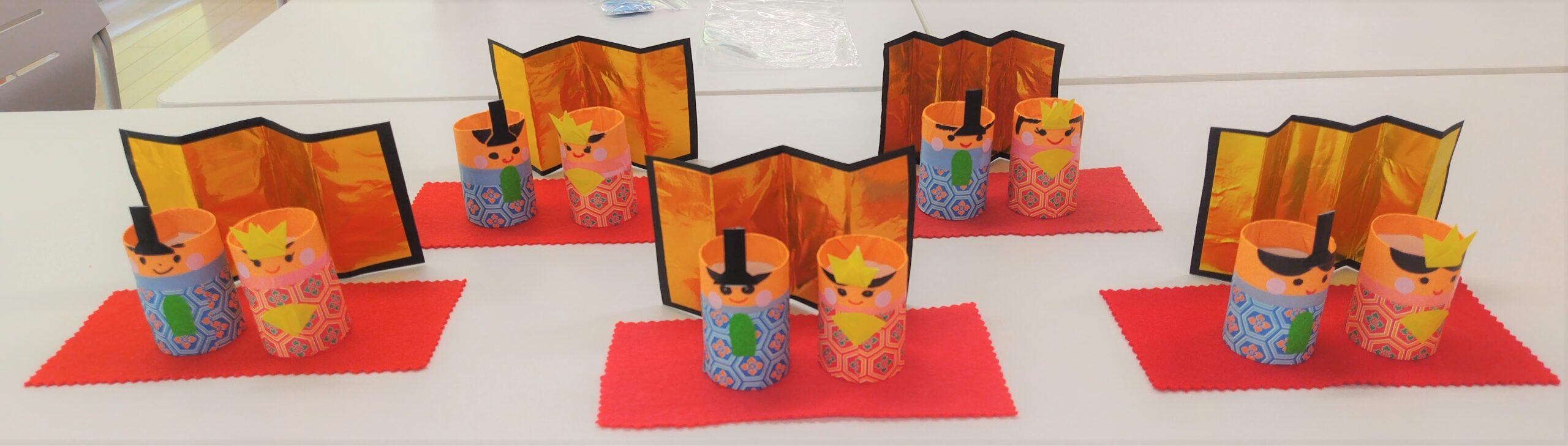 小物づくりでは、金屏風と緋毛氈つきのきれいでかわいいおひなさまを作りました。皆さんお家に飾ってくれたかな?