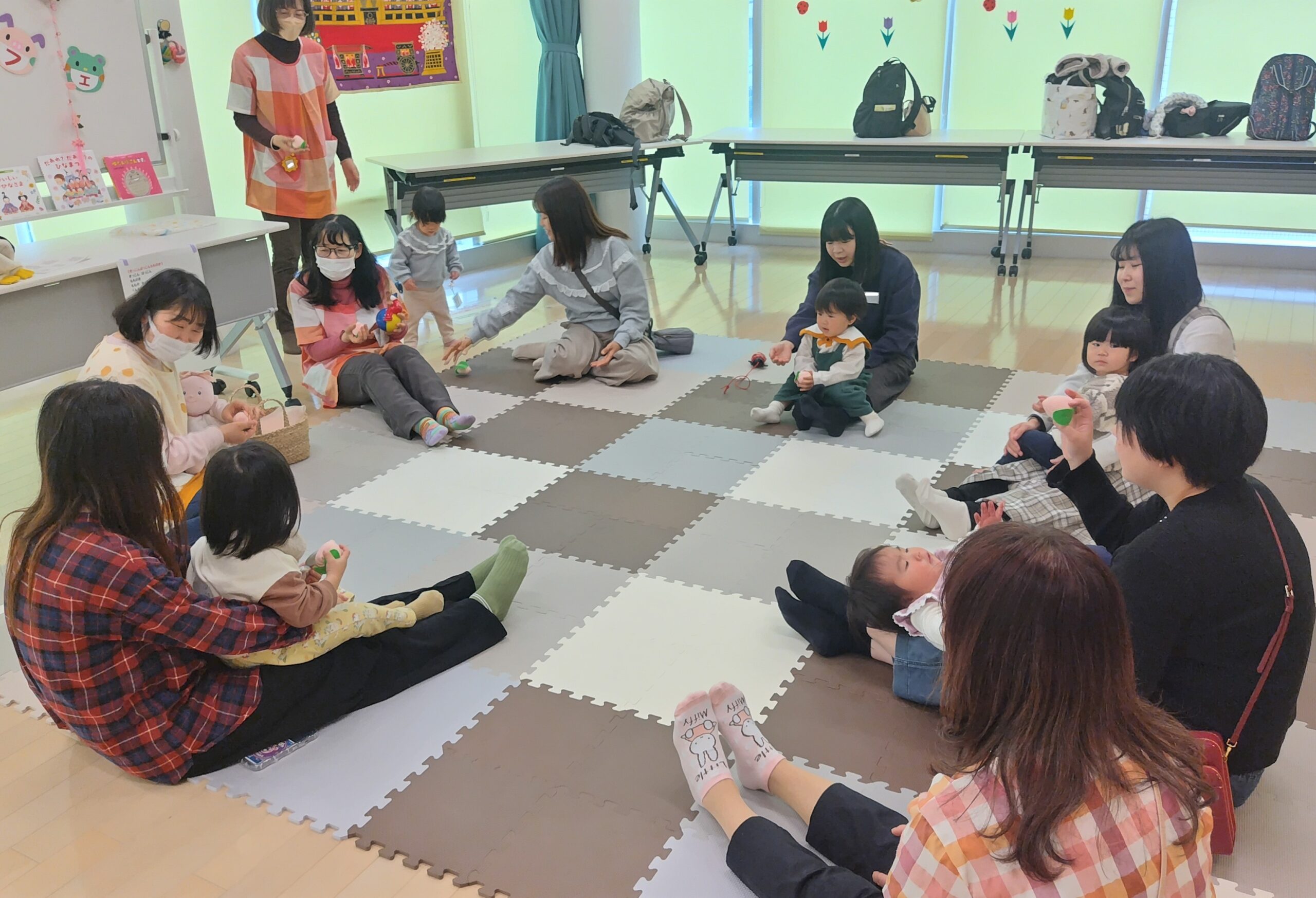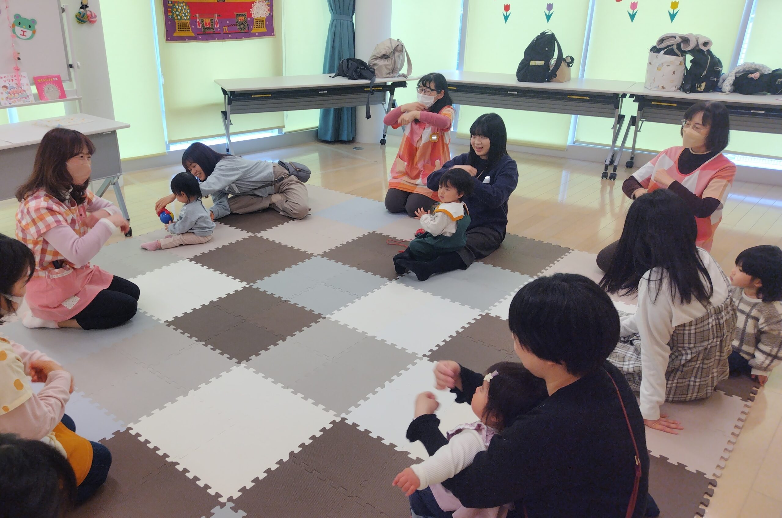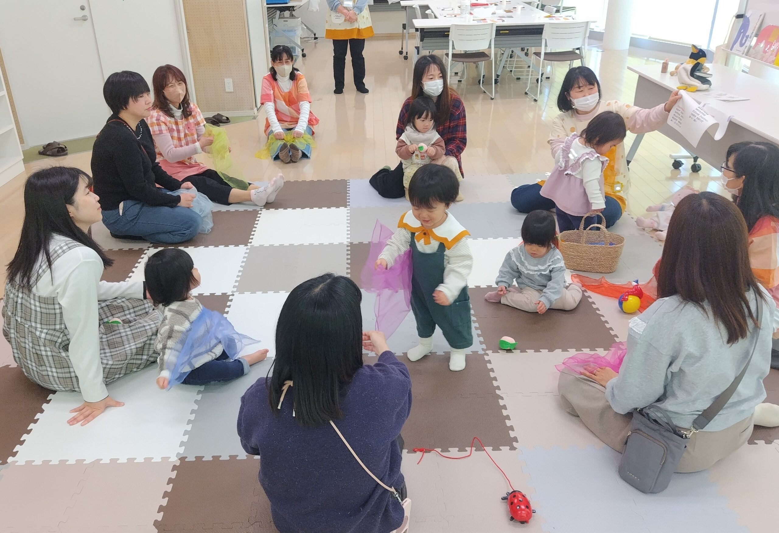 いろいろなわらべ歌をうたいながら、お子さんを膝にのせて親子のスキンシップを楽しんだり、オーガンジーの布を使ってみんなで和気あいあいとふれあって遊びました。