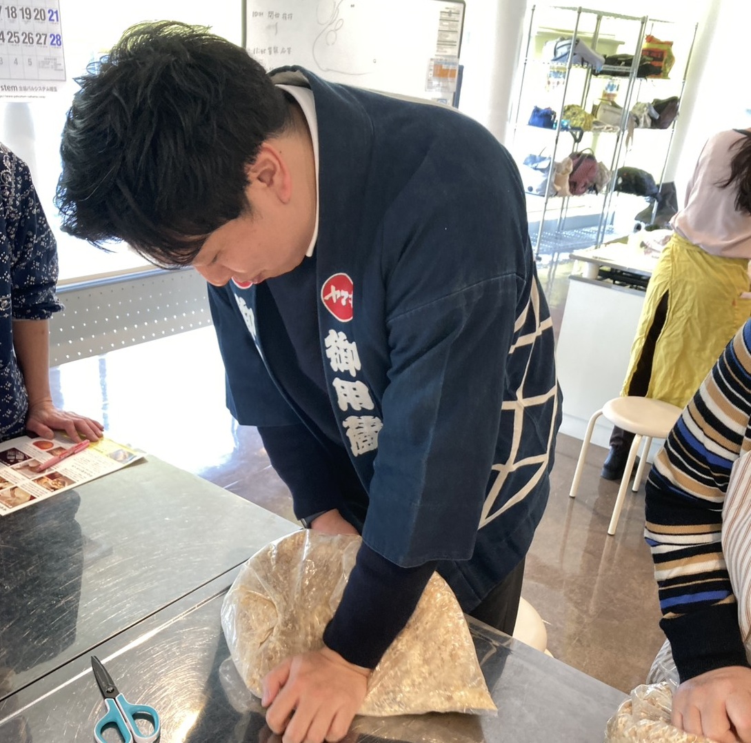 2月26日(木)、ぱる★てらす調理室で(株)ヤマキの逸見さんを講師に「お待ちかね!今年もやります、味噌つくり」を開催しました。ヤマキ醸造の白米麹と壱岐対馬産の浜御塩を大豆に混ぜ、すり合わせ、大豆を手作業でつぶす作業はなかなか体力が要る作業でした。
