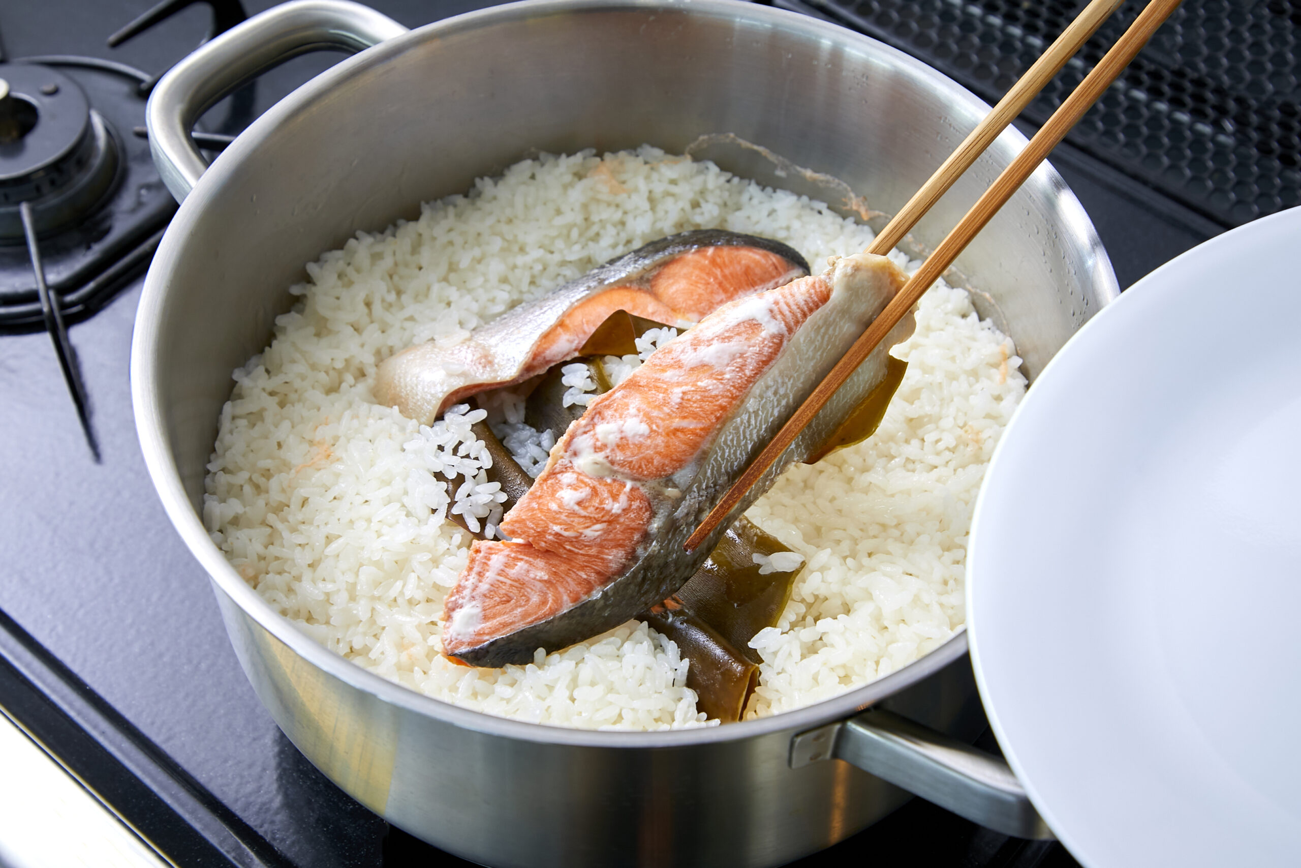 お釜でも代用可。炊き込みにしない場合は、炊き上がったごはんの上にほぐした鮭の瓶詰を散らしてもいいですね。