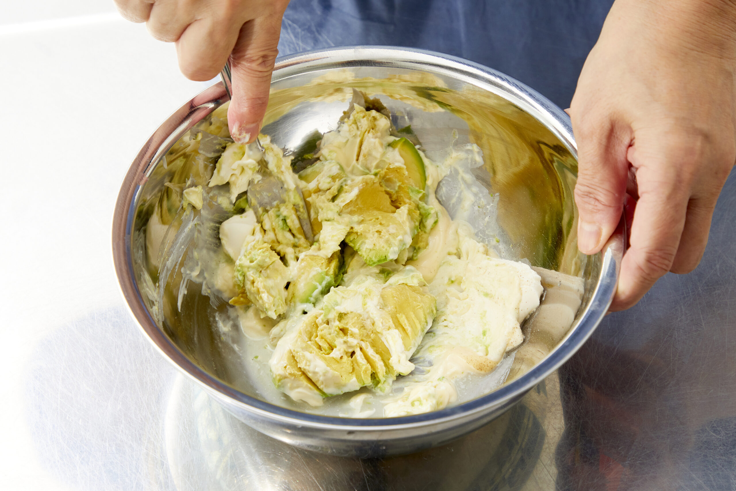 - ❸アボカドは皮と種をとり、レモン汁をふり、フォークでつぶし、マヨネーズとクリームチーズを混ぜ、塩・こしょうで味付けをする。