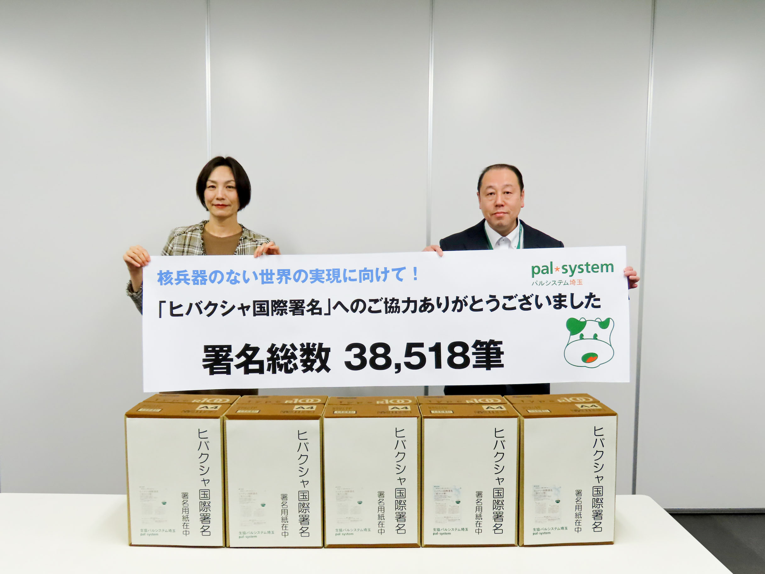 核兵器のない世界の実現に向けて、2017年から「被爆者が訴える核兵器廃絶にむけた国際署名」(ヒバクシャ国際署名)に取り組みました。3ヶ年に渡って協力を呼びかけた結果、パルシステム埼玉に寄せられた署名は合計38,518筆、パルシステムグループ全体では24万8,216筆と多くの署名が寄せられました。ヒバクシャ国際署名は、日本被団協を通じて2021年1月に国連へ署名目録が提出され、同月22日には核兵器のない世界への一歩となる、核兵器禁止条約が発効を迎えました。