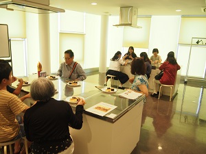 報告会の最後は、食育サポーターの方々が調理してくださった韓国の海苔巻き“キンパプ”と、お菓子“ホットク”をいただきながら、各テーブルで交流を図りました。