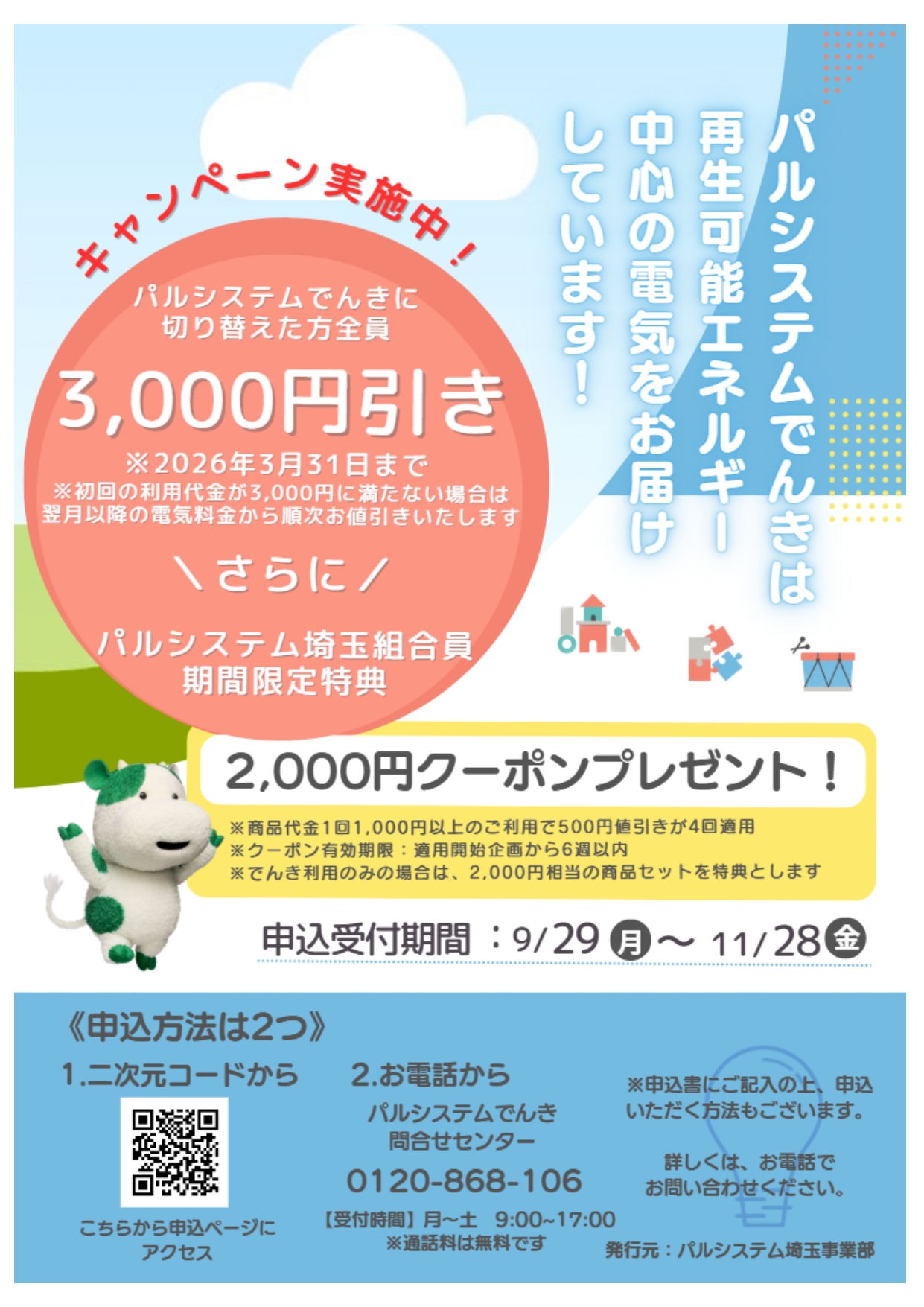 9月29日(月)~11月28日(金)まで、パルシステムでんきに切り替えた方全員「3,000円引き(2026年3月31日まで)※」、さらにパルシステム埼玉組合員は期間限定で「2,000円クーポン」をプレゼント!