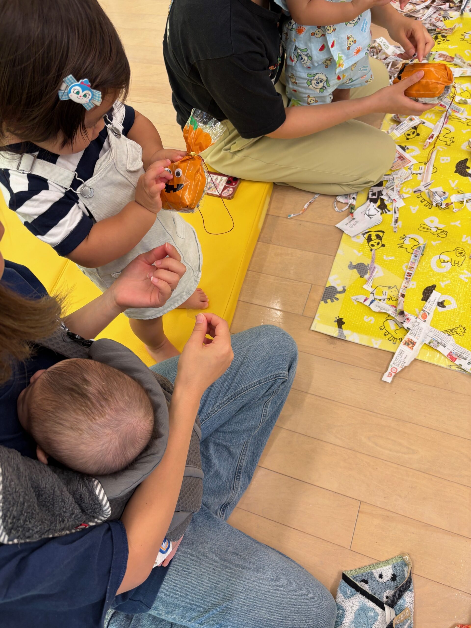 たくさん遊んだ後は、新聞紙をハロウィンの袋に丸めて入れて目のシールを貼って飾りにしました。