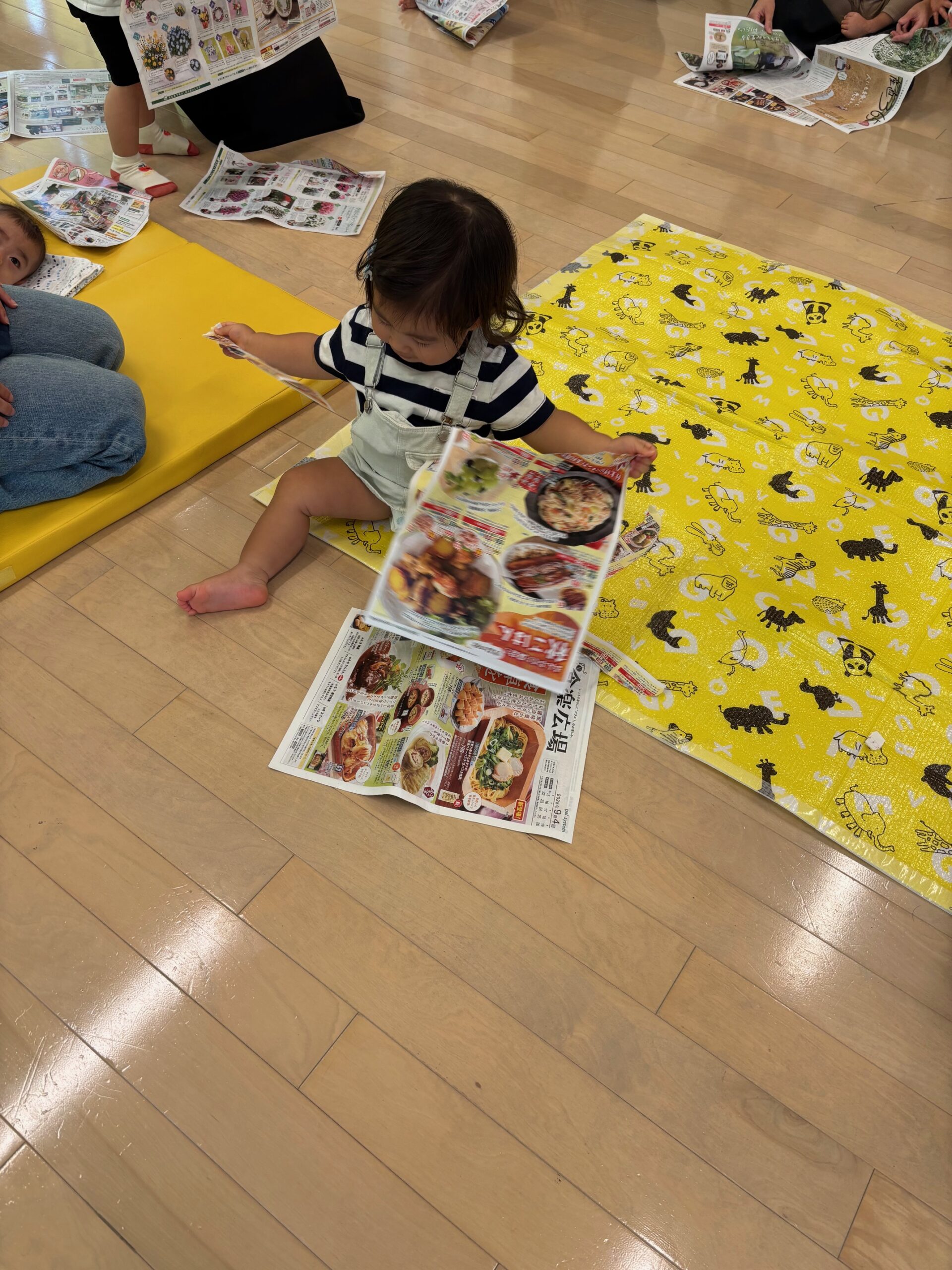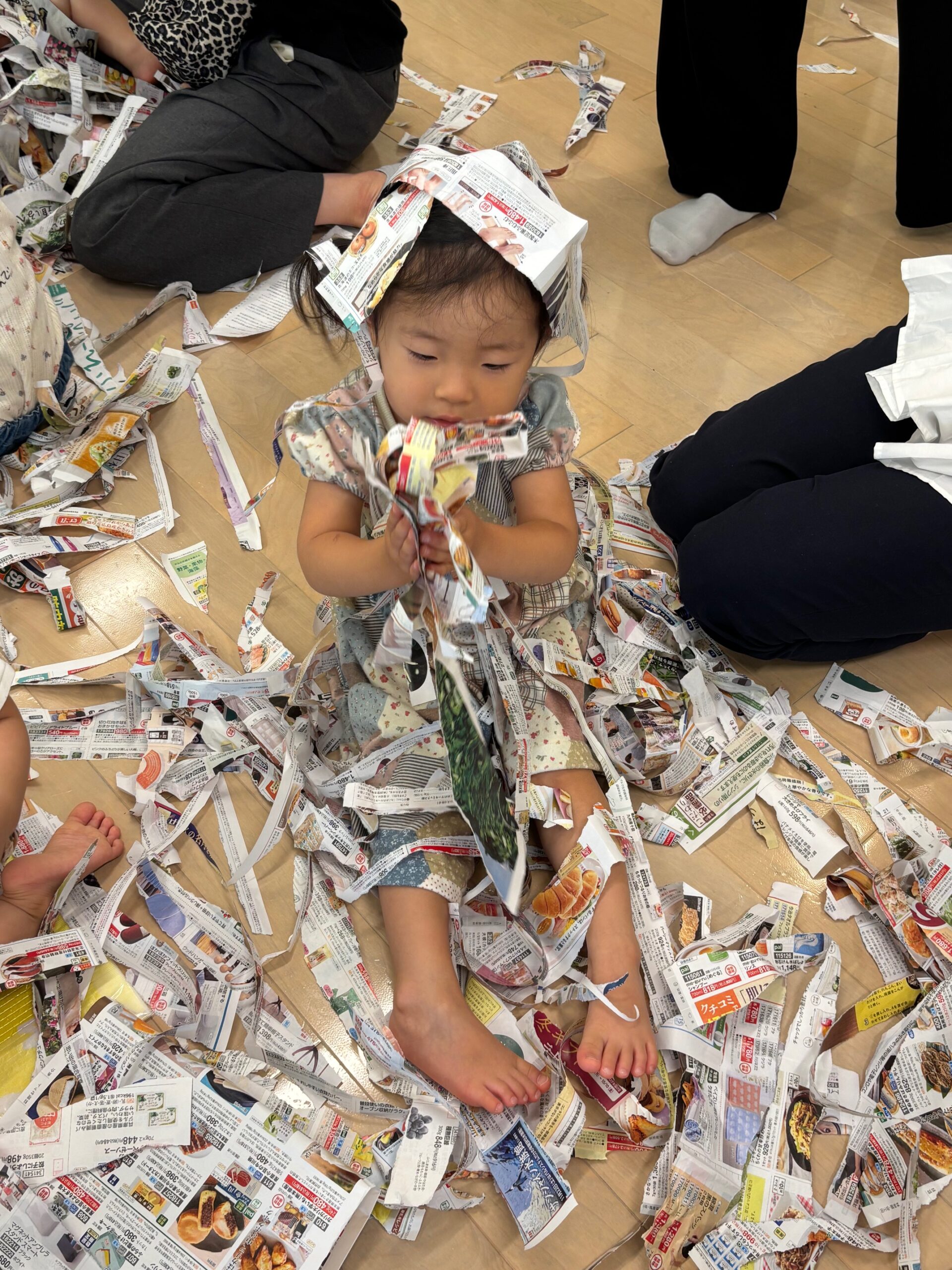ママに新聞紙のシャワーをしてもらって大喜びでした。その様子がとってもかわいい♪