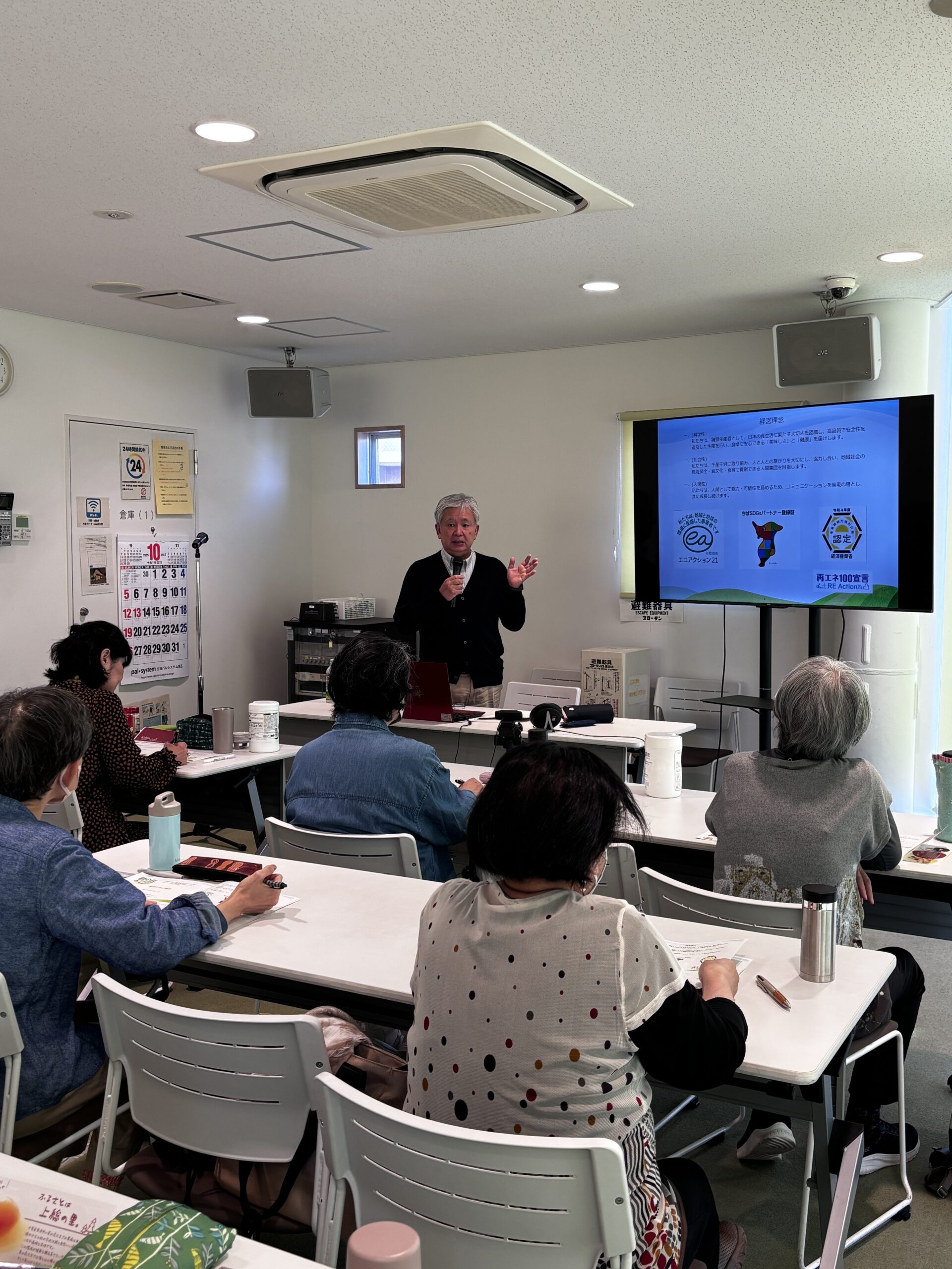 梅原さんから、菜の花エッグの経営理念や会社概要についてお話しいただきました。産直たまごの品質を支える「よい鶏・よい餌・よい管理」の3つの柱について詳しく説明していただき、特に遺伝子組み換え飼料を使用しないこだわりや、地域での取り組みについて学ぶことができました。普段なかなか知ることのできない専門的で興味深いお話をお聞きすることができました。