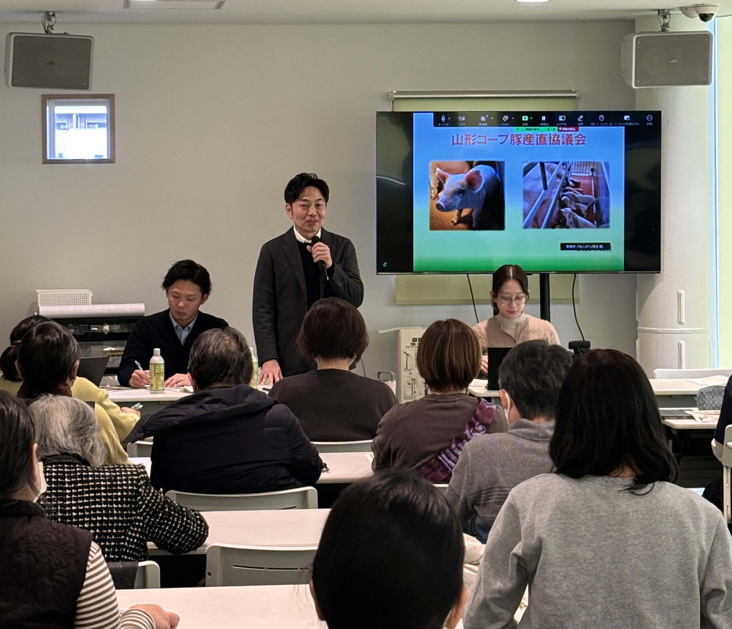 続いて山形コープ豚産直協議会の土屋さんより、産直産地「山形コープ豚産直協議会」の成り立ちや取組みについてお話がありました。安全でおいしい豚肉を作るためのこだわりについて解説いただき、参加者は熱心に耳を傾けていました。講演の最後には、普段なかなか見ることができない豚舎の様子を動画で視聴しました。生産者のみなさんが、一頭一頭の状態を日々細かく観察し、愛情を持って接している様子が非常に印象的でした。