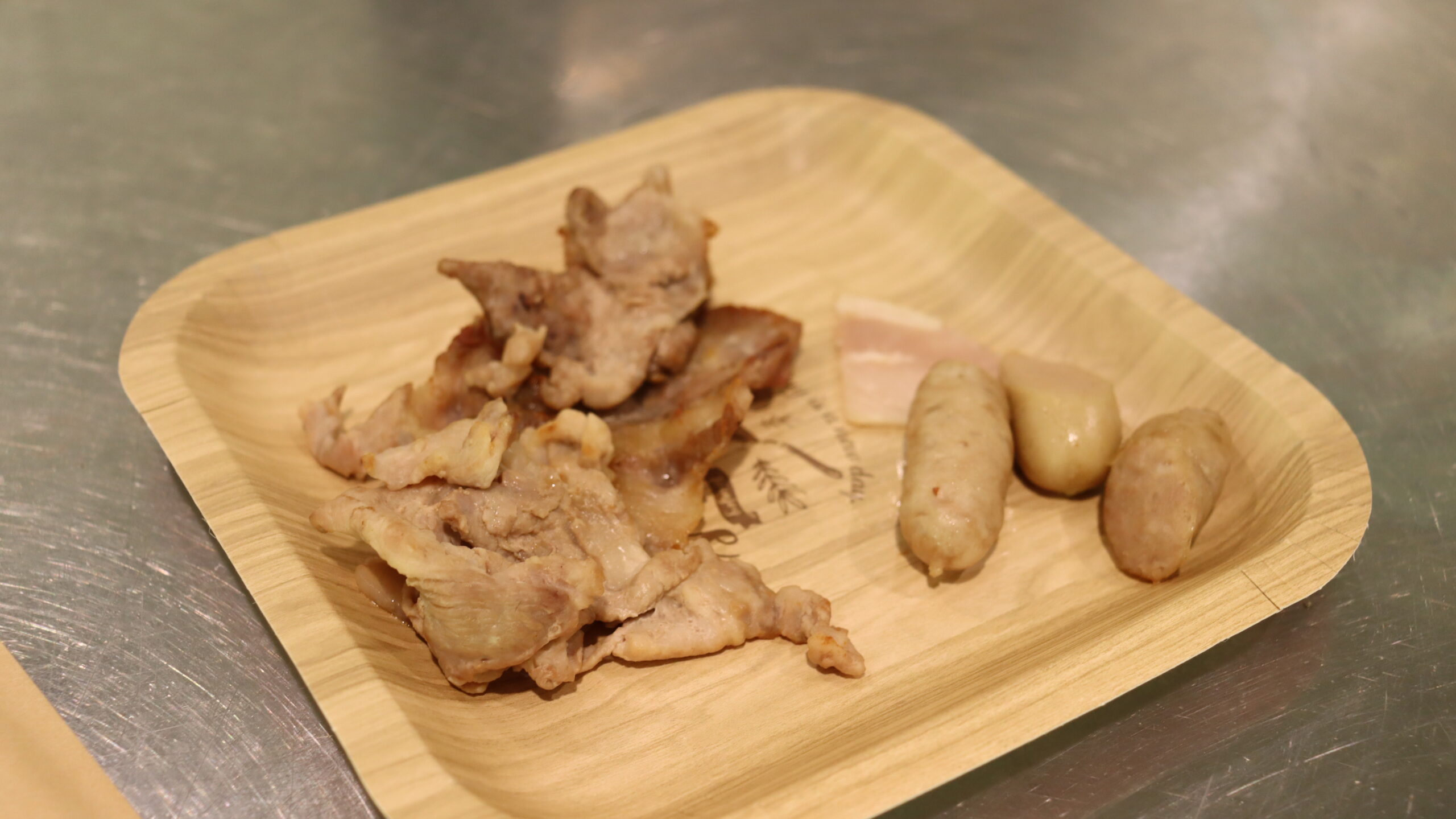 イベント後半では、調理室へ部屋を移動して試食交流の時間を設けました。今回は特別に、山形コープ豚産直協議会で生産されたカタロースの豚肉を塩の味付けで焼いて提供しました。その他にも、加工品である『ポークウインナー』、『ロースハム』、新商品の『素材を味わう!あらびきminiポークウインナー』も試食もありました。参加者は学習会を通じて、豚肉やハム・ウインナーのおいしさをより実感できたのではないでしょうか。組合員は土屋さん、佐藤さん、本多さんとの交流を深め、有意義な時間を過ごすことができました。