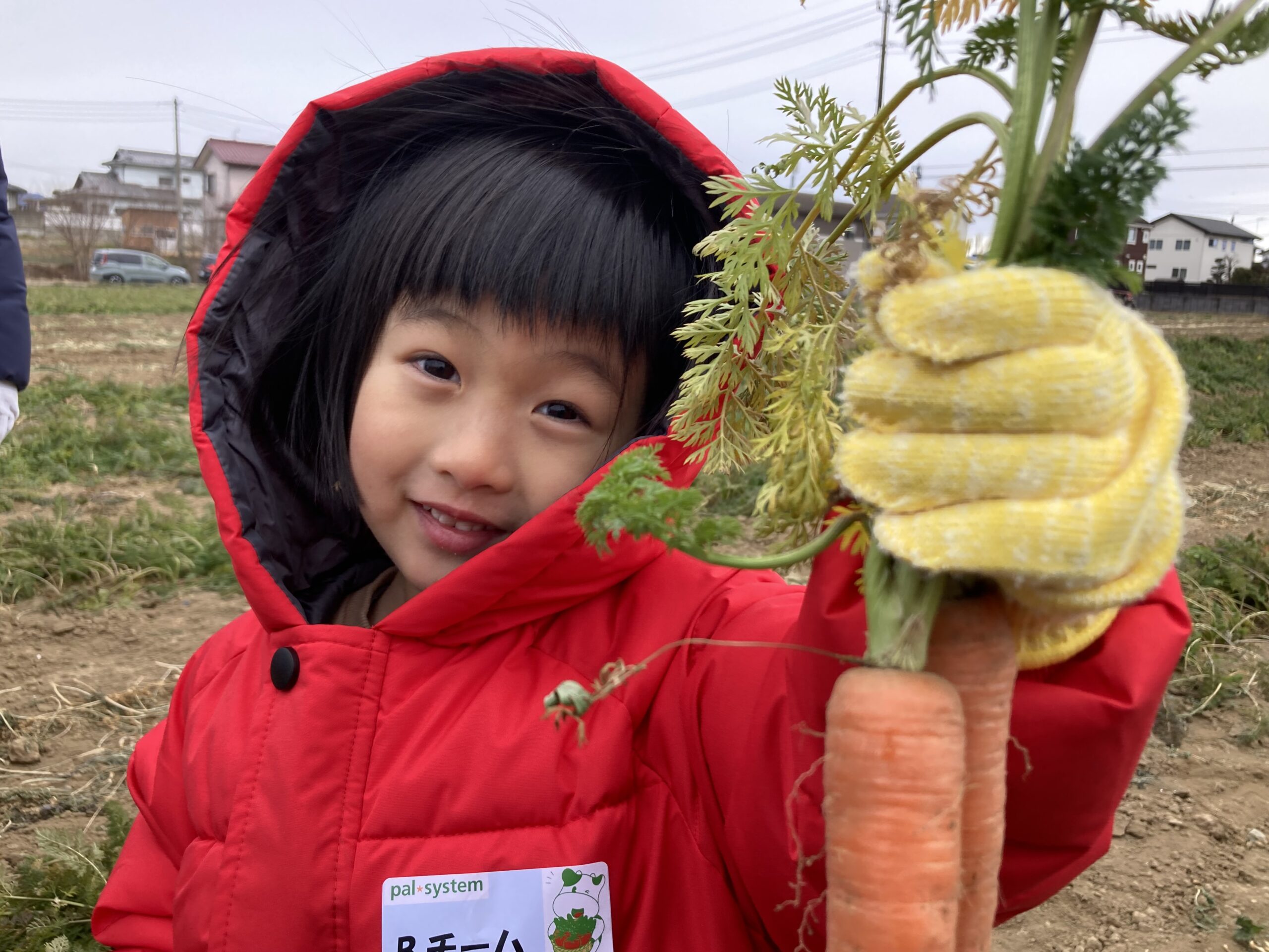 ねぎの根元をしっかりと握り、一本一本丁寧に収穫しました。土から抜けた瞬間の感触に、大人も子どもも歓声をあげて楽しみました。特に子どもたちは、自分の背丈ほどもある大きなねぎを収穫できた時の達成感で、満面の笑顔を見せてくれました。おまけに人参の収穫体験も!思いがけないプレゼントに、大変喜んでいただけました。