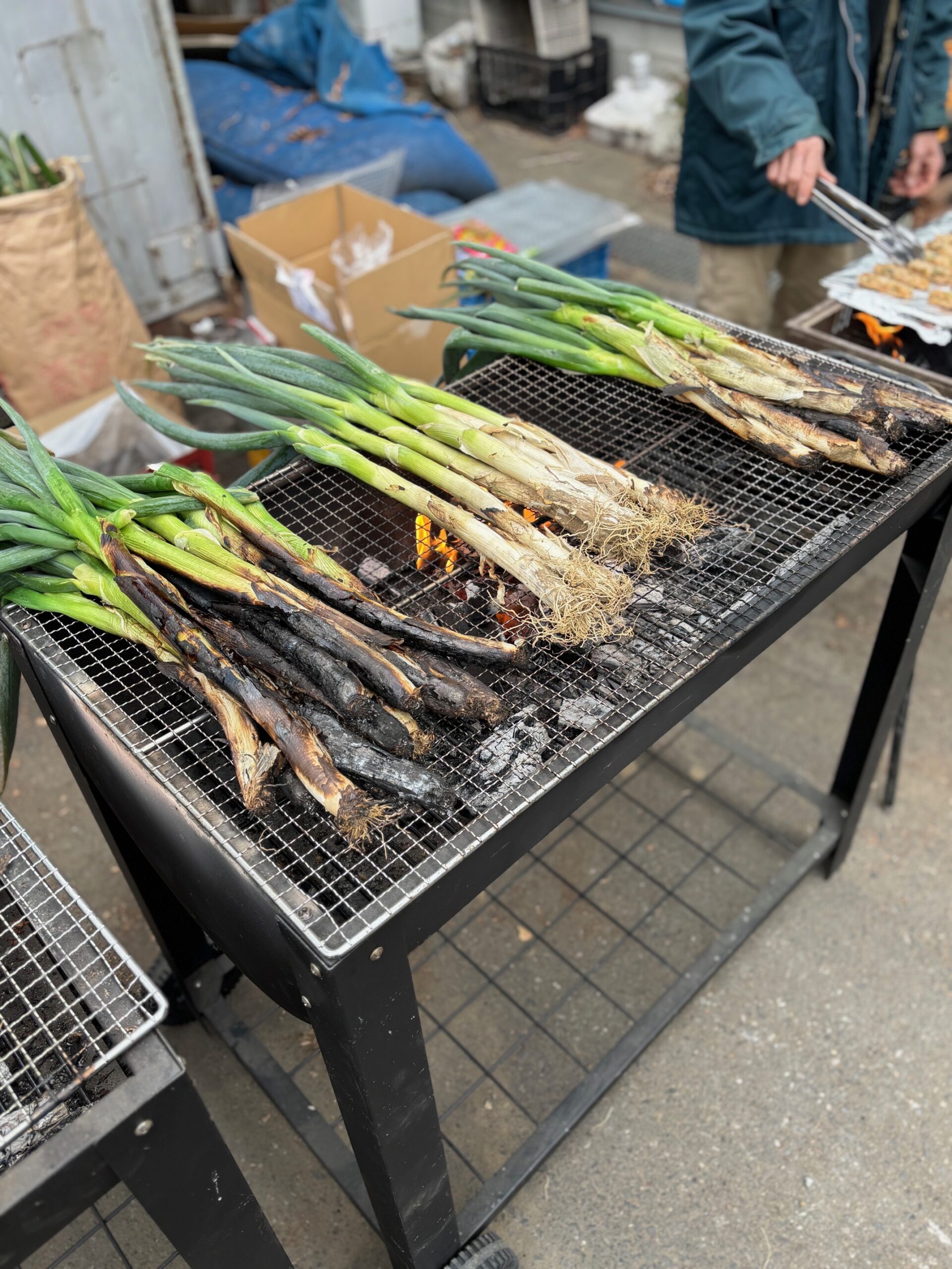 収穫したばかりの新鮮なねぎを、その場で一本焼きにして試食していただきました。焼きたてのアツアツをそのまま手に取って召し上がっていただきました。火を通すことで引き出されるねぎの甘みに、多くの方が驚かれていました。