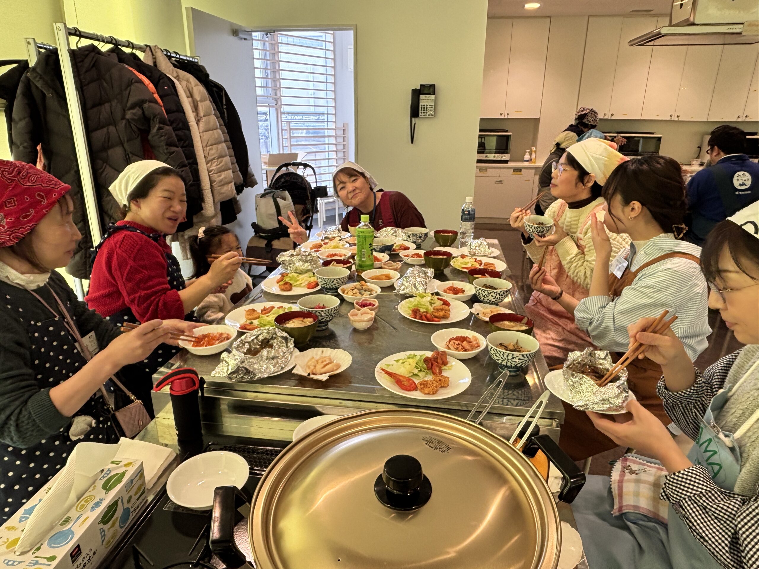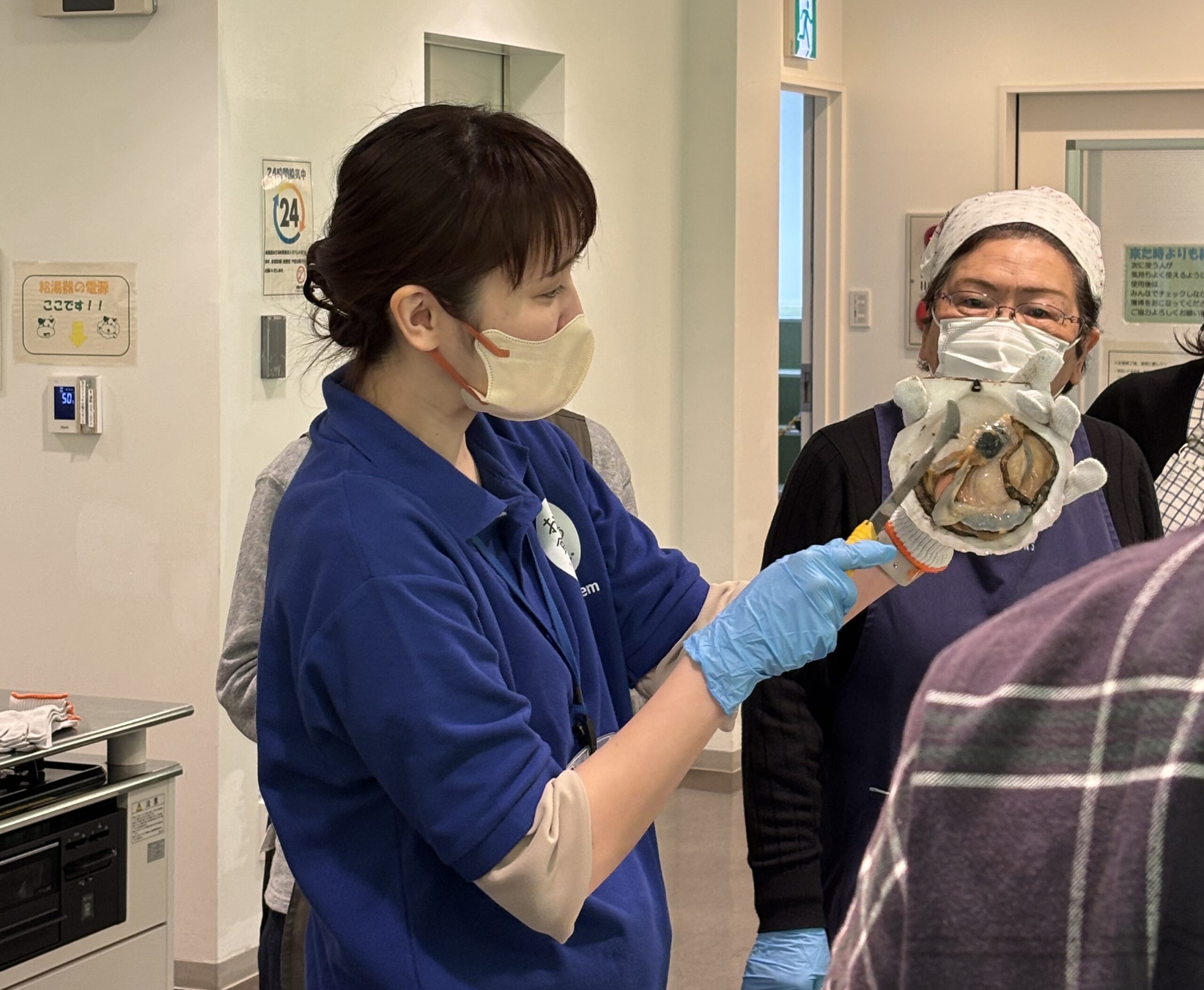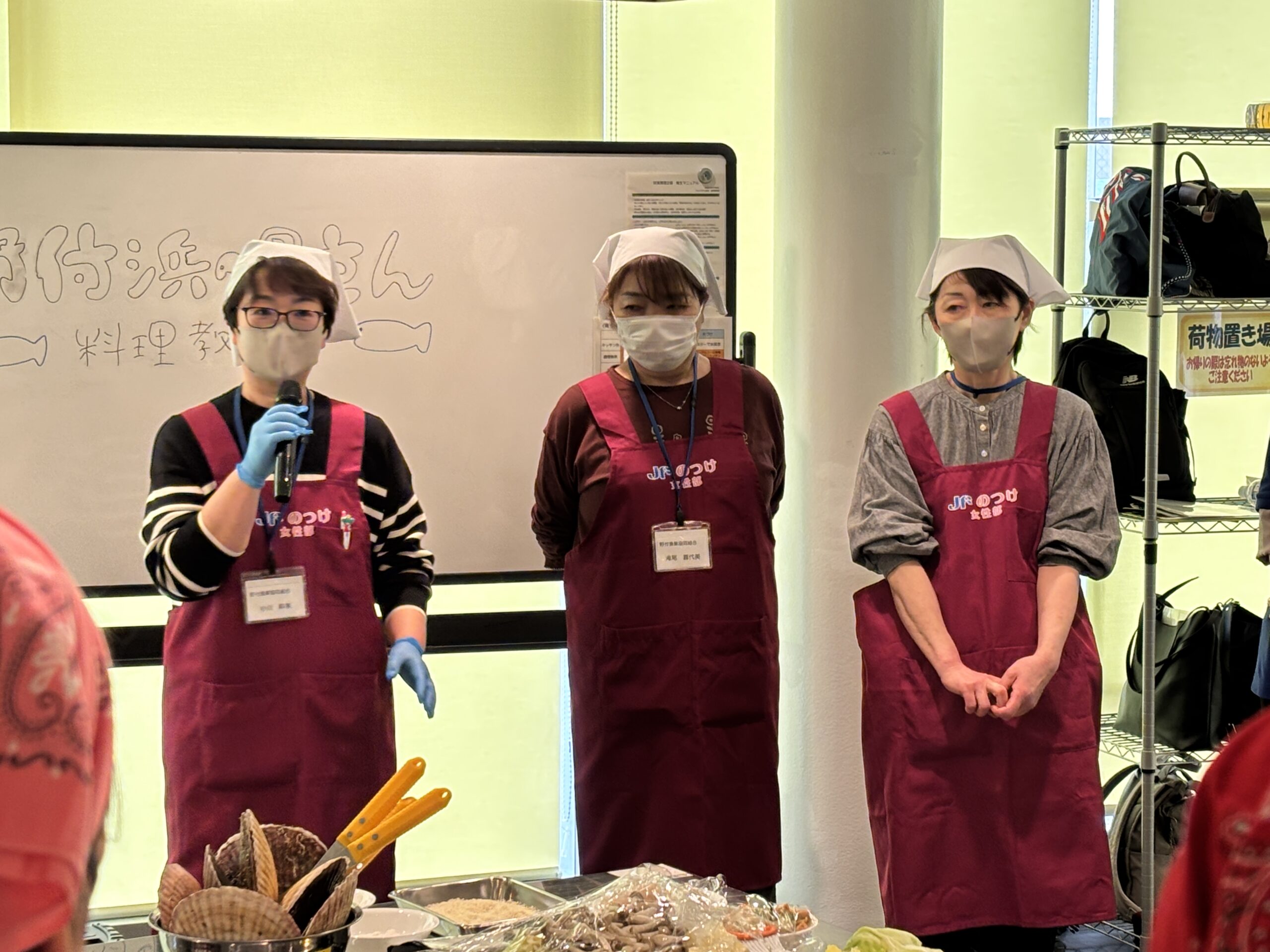 後半は、いよいよ会場を調理室に変えて、料理教室のスタートです!浜の母さんたちから一品ずつ丁寧に作り方を教わりながら、参加者も一緒に調理を楽しみました。中でも、「ホタテの殻むき」の指導では、鮮やかな手つきで次々と殻を剥いていく様子に会場からは歓声の声が。参加者のみなさんも専用のヘラを手に、真剣に殻向きに挑戦しました!