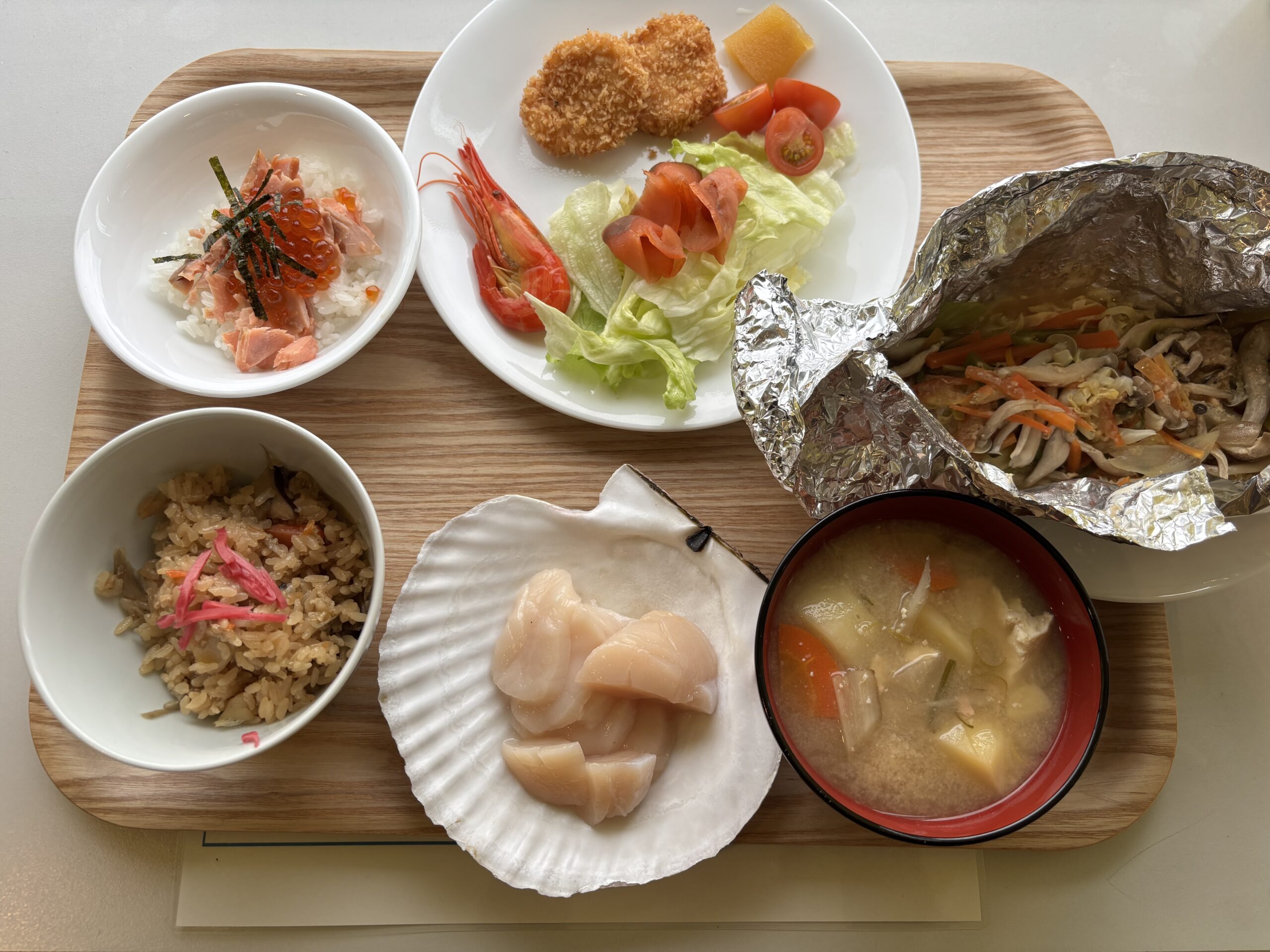 最後は自分たちで作った料理を囲んでの昼食交流の時間です。メニューは、①鮭のちゃちゃん焼き ②スモークサーモンのサラダ ③鮭いくらミニ丼 ④ほたてのお刺身 ⑤ほたてフライ ⑥ほたてごはん ⑦鮭汁 をいただきました。とても盛だくさんの内容で、どの食材も大変おいしく好評の声が飛び交いました。