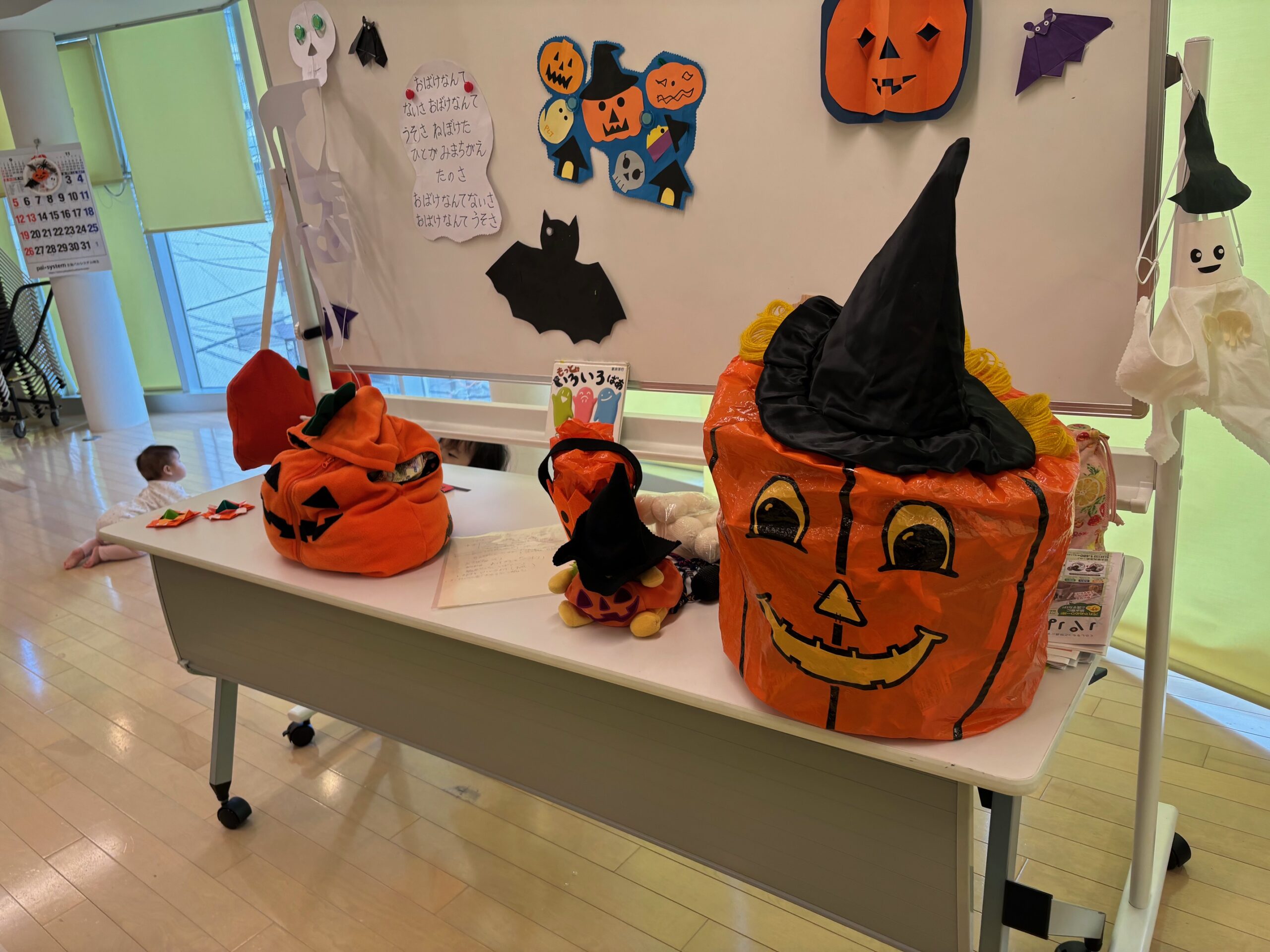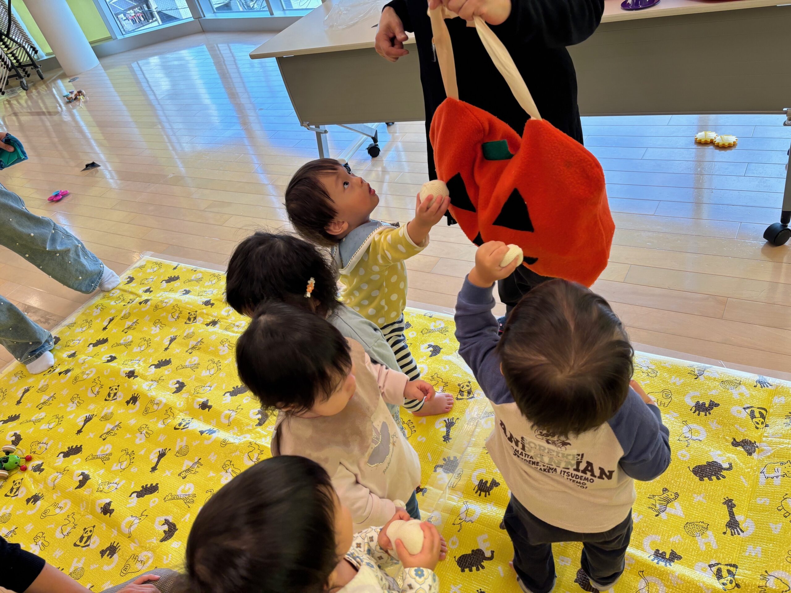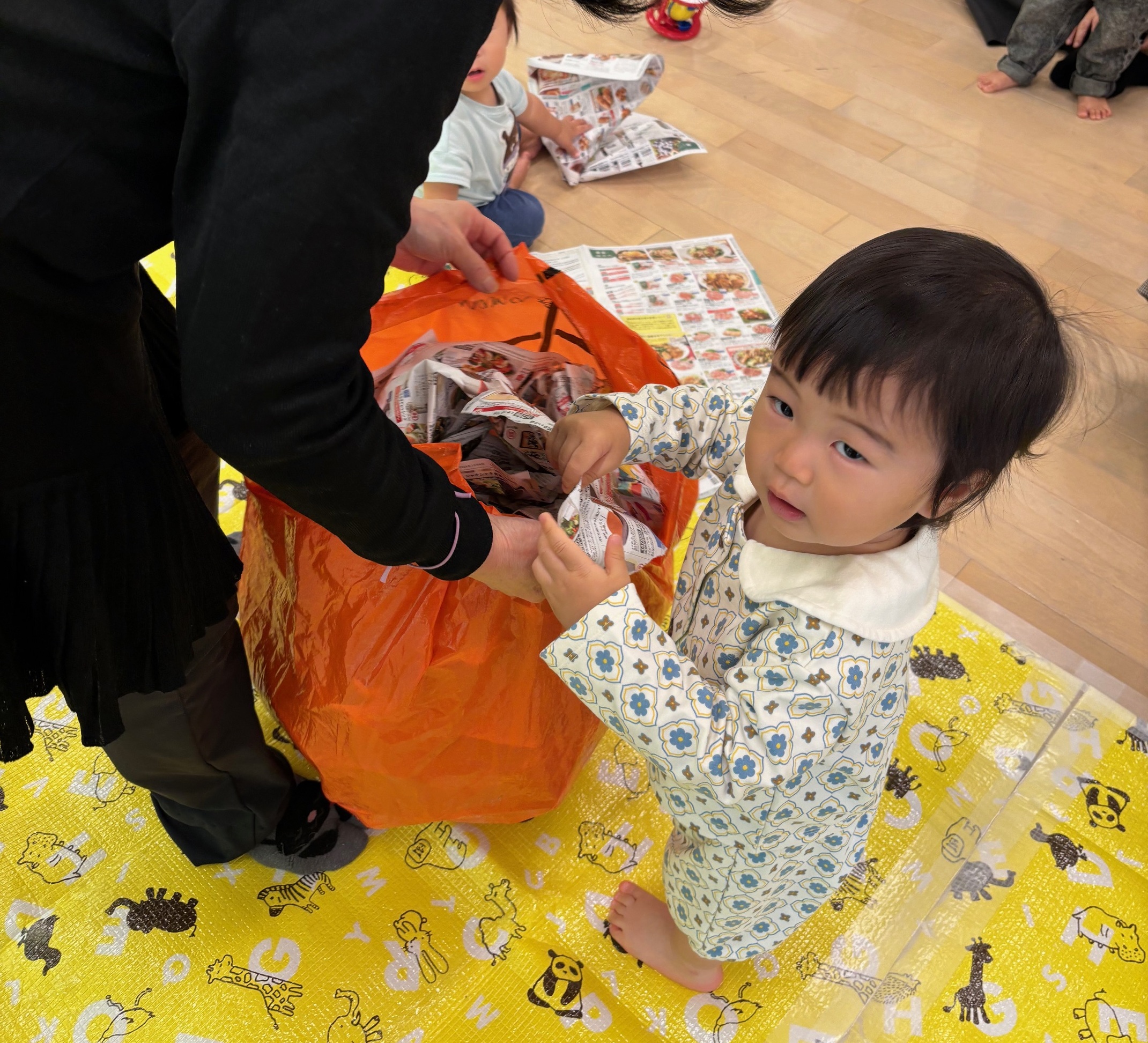 「おばけなんてないさ」「おもちゃのチャチャチャ」の歌から始まり、2,3人のグループになってお互いの自己紹介を行いました。それからみんなで古紙をくしゃくしゃに丸めてオレンジのビニール袋に入れて大きなかぼちゃが完成!