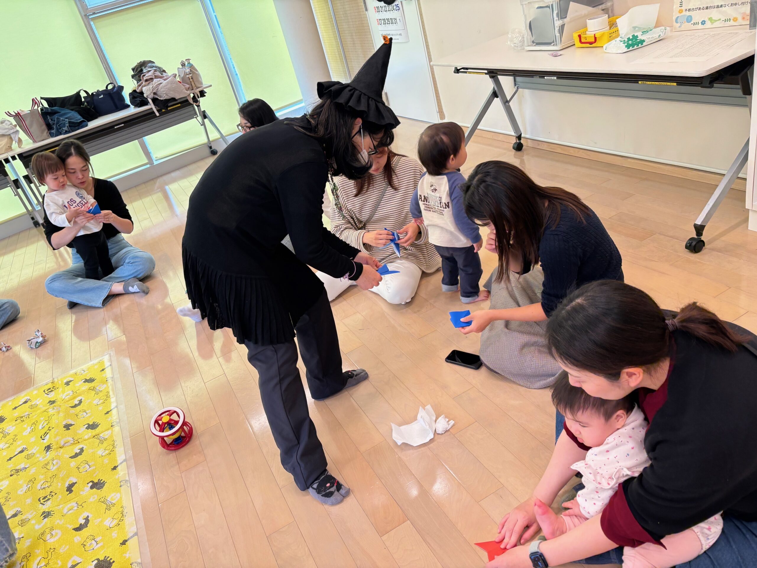絵本読み聞かせのあと折り紙でこうもりを折りました。少し難しかったのですが、ママたちが頑張って折ってくれました。