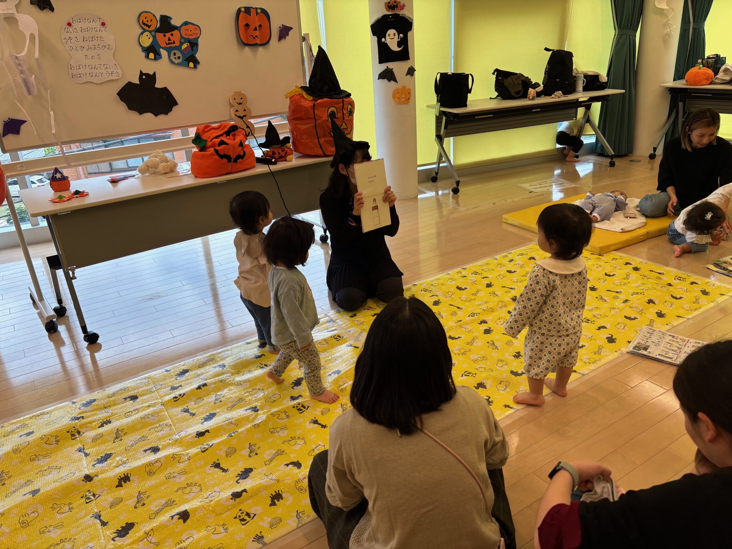 10月24日(金)の親子ふれあいサロンは親子ふれあい遊びの講師大塚さんとハロウィンの大きなかぼちゃを作って遊びました。14組29人の親子が遊びに来てくれました。