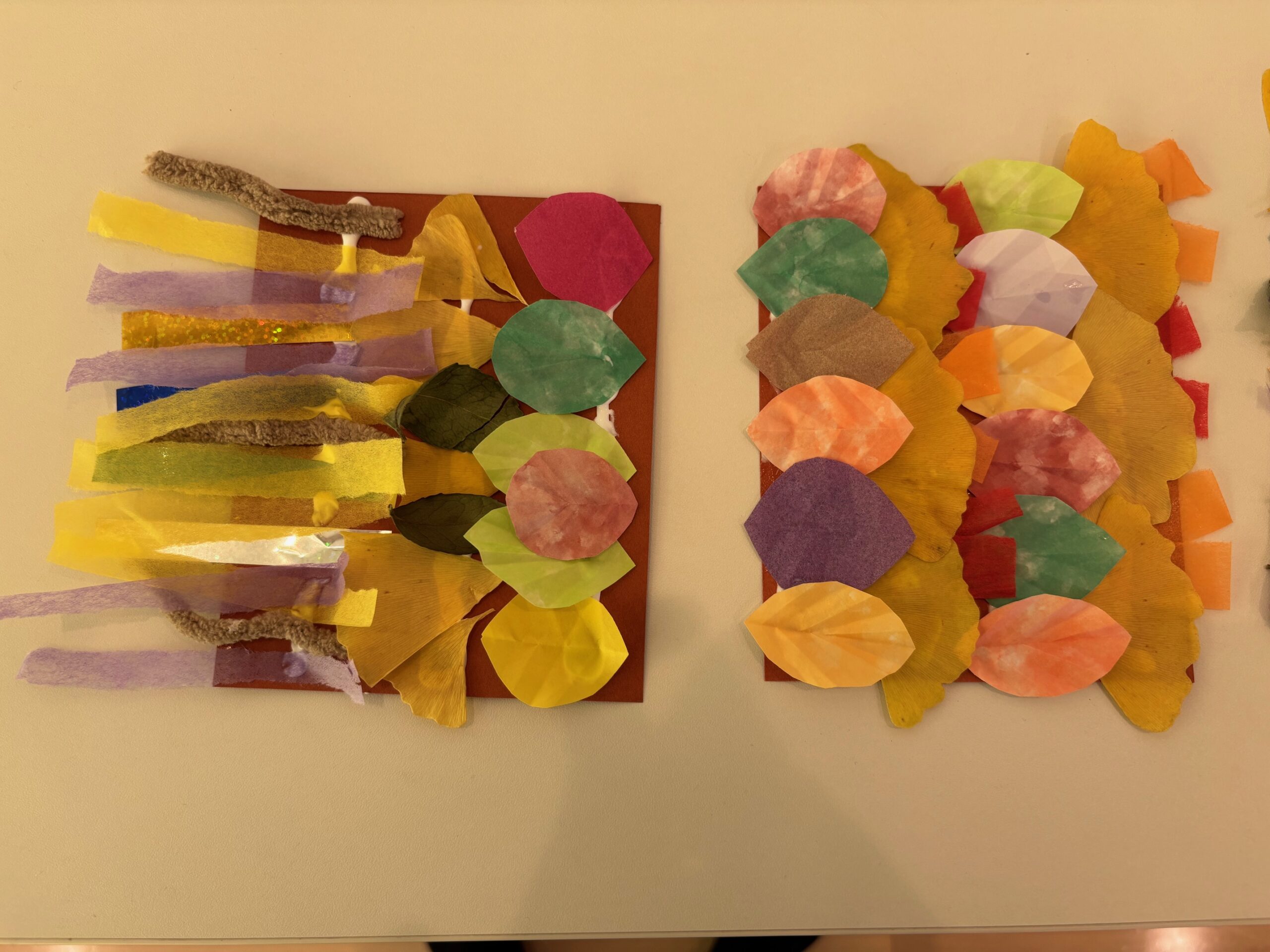 秋のコラージュは、いちょうの葉っぱや、お花紙、折り紙など異なる素材を組み合わせて貼り付け、みのむしの飾りを作ります。