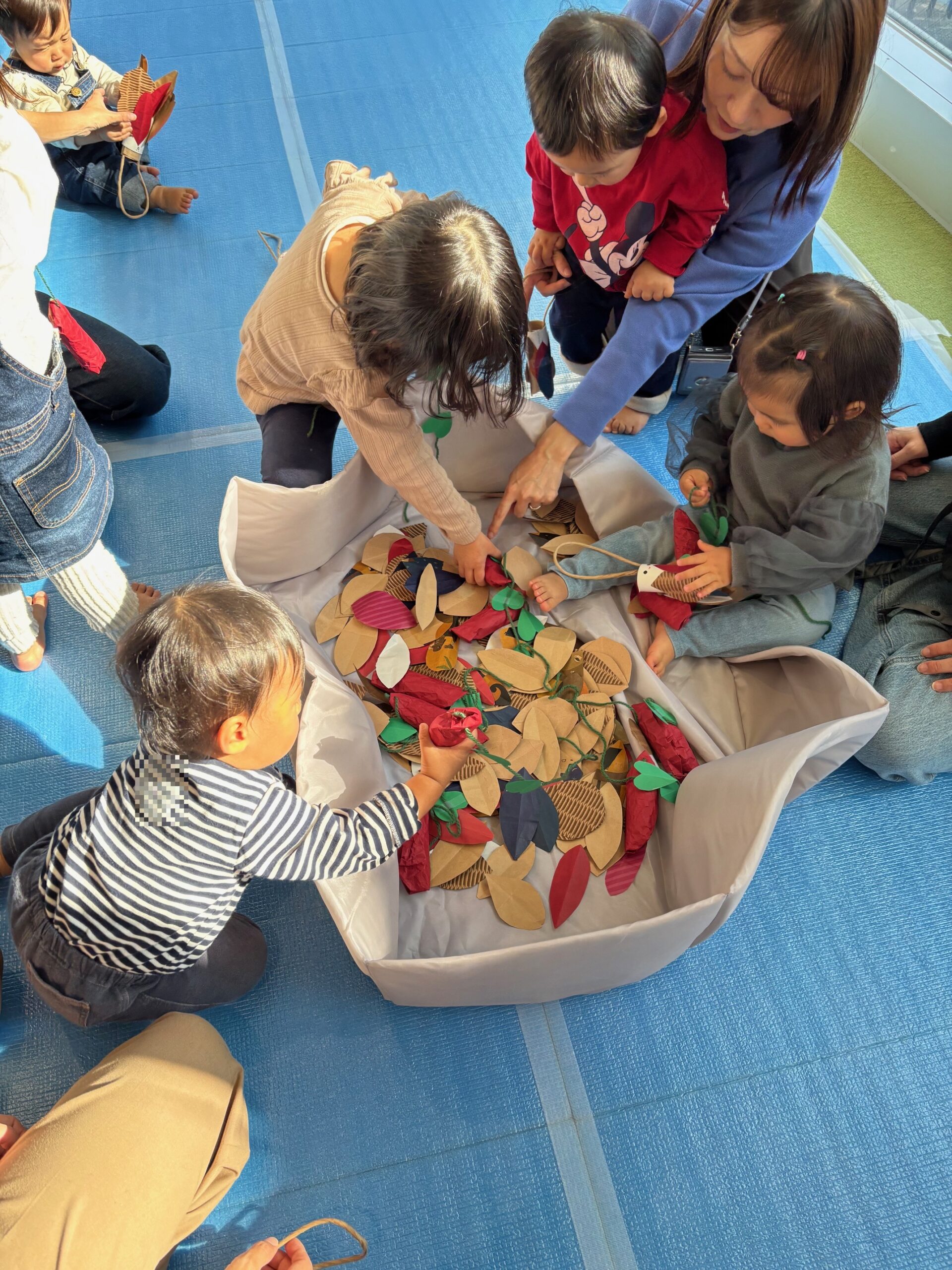 11月14日(金)の親子ふれあいサロンは親子ふれあい遊びの講師星野さんと、いもほりごっこやみのむしを作って遊びました。