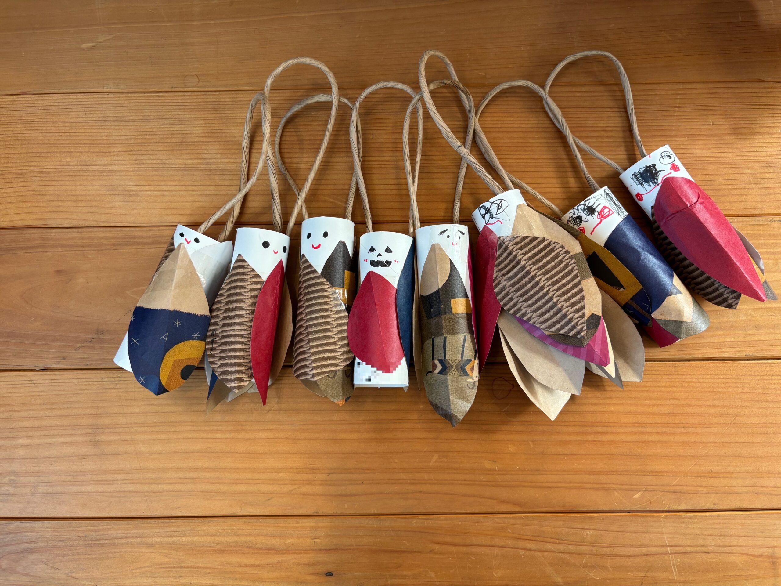 お気に入りの葉っぱを見つけて貼ってみのむしの出来上がり。