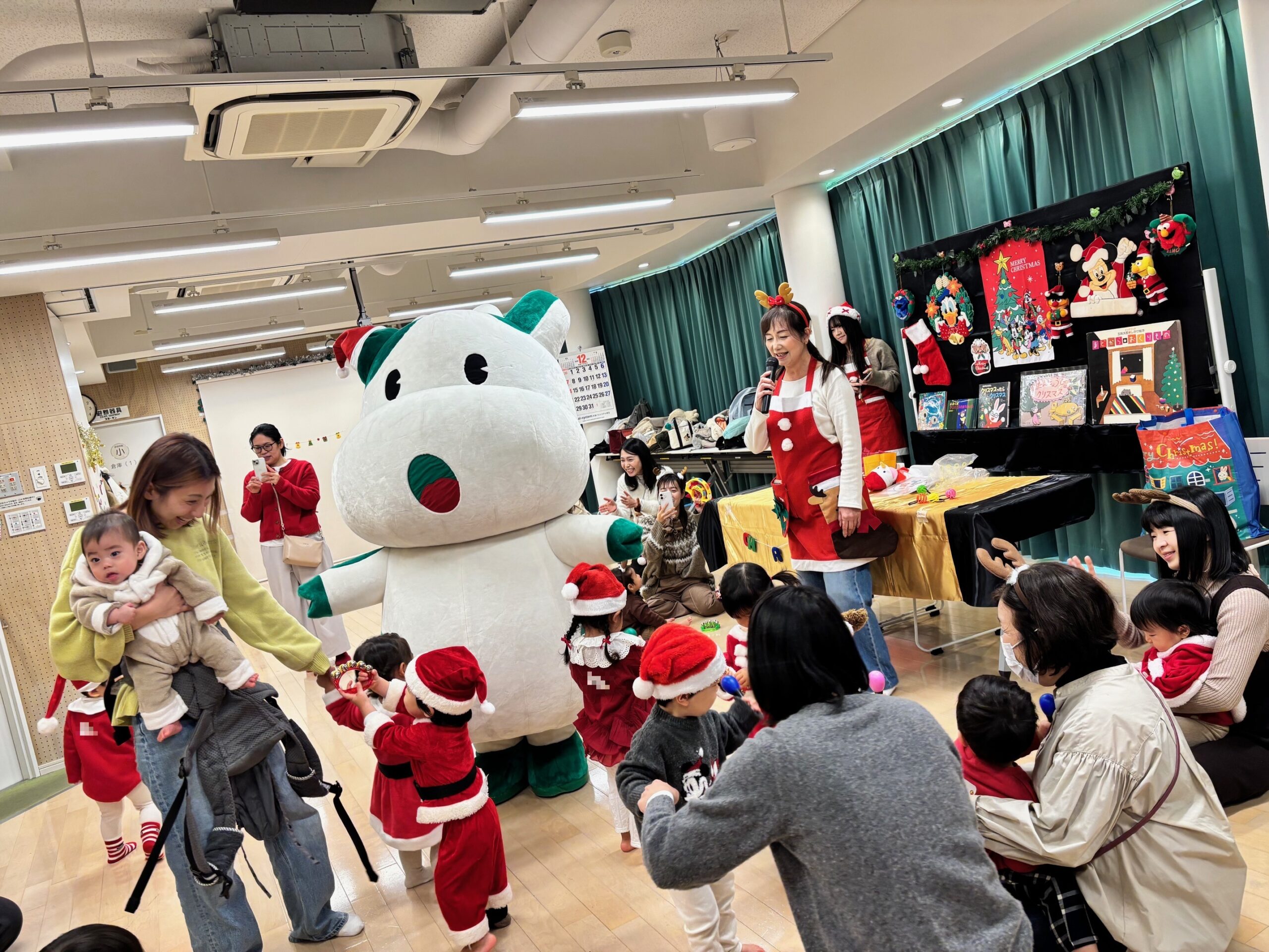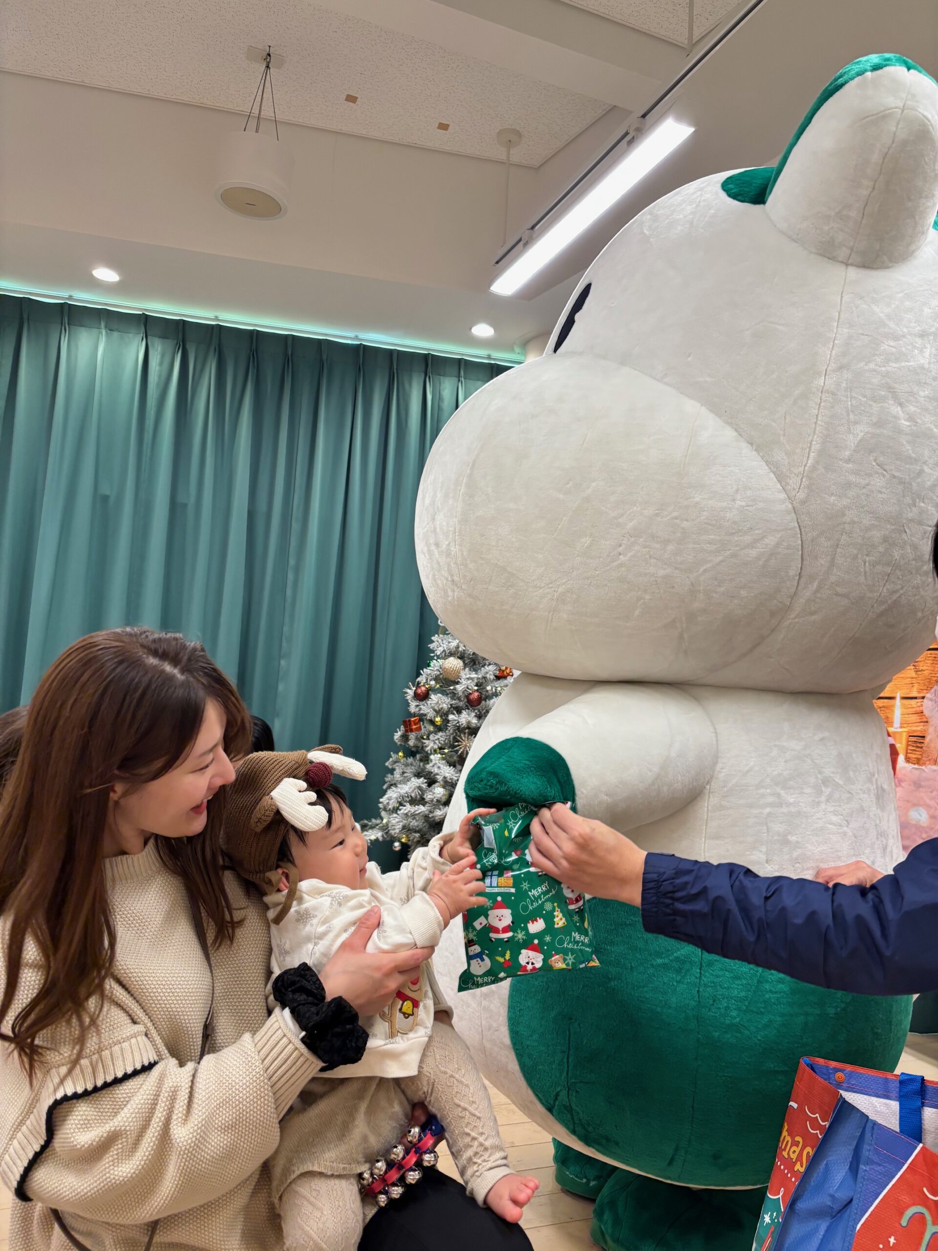 続いて大型絵本を読んでいただいたり、赤鼻のトナカイでフラダンスを踊ったりクリスマスを楽しんでいると、こんせんくんがプレゼントを持って来てくれました。