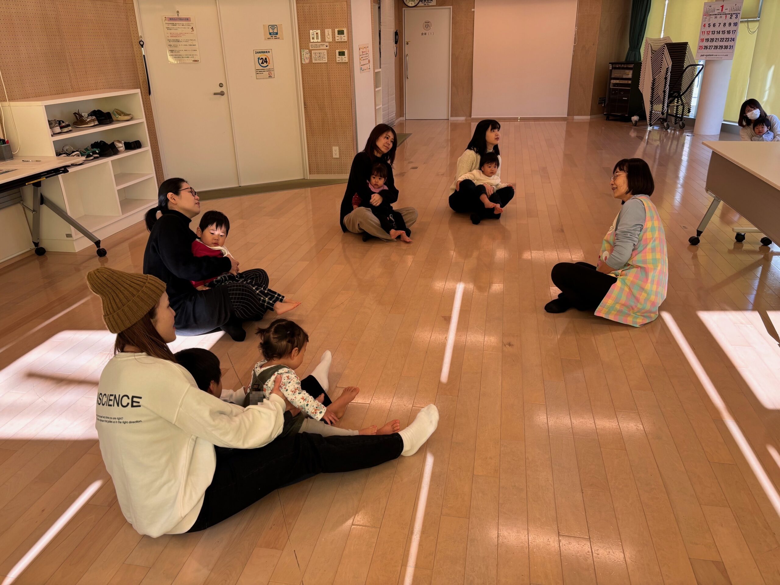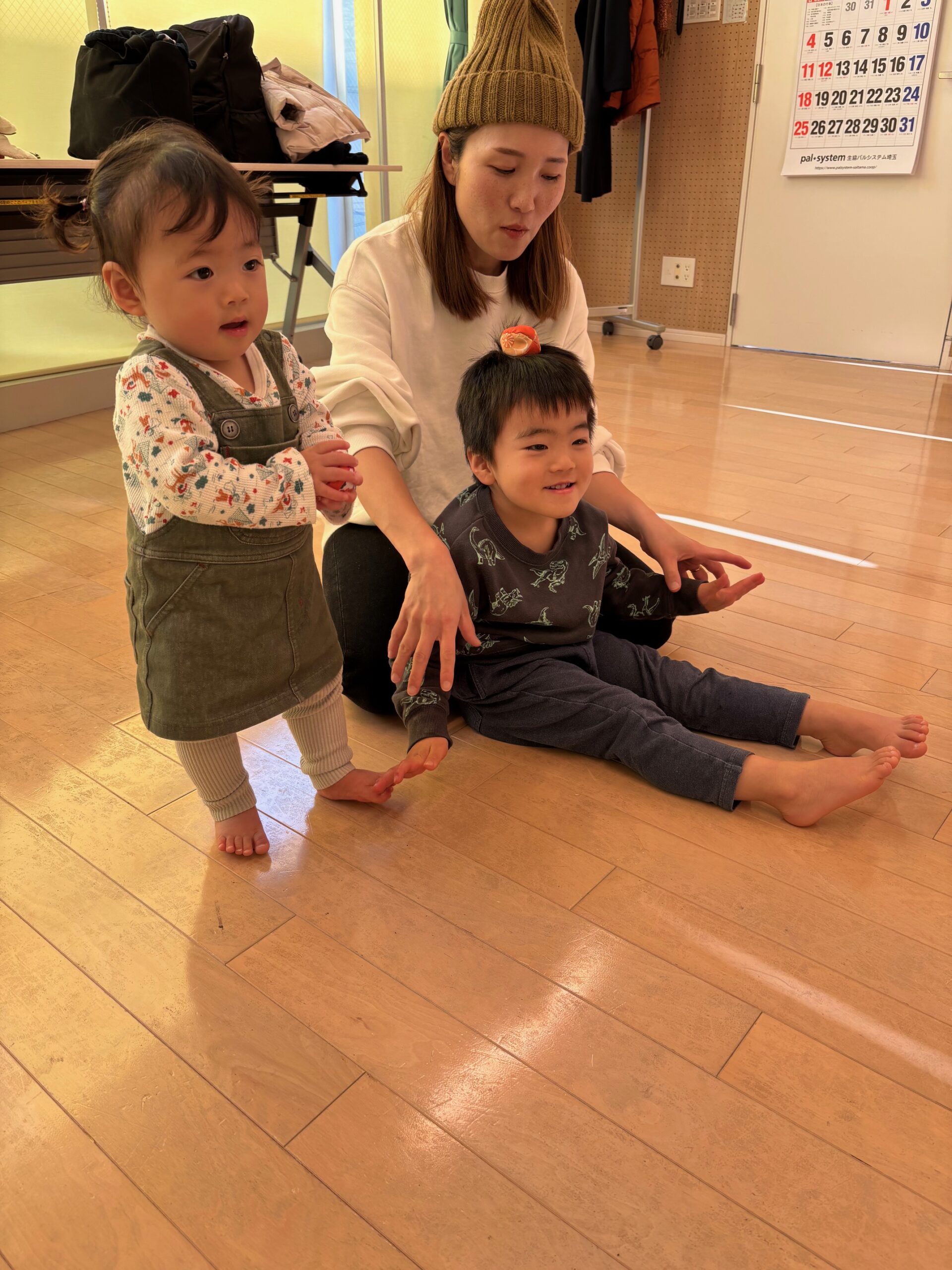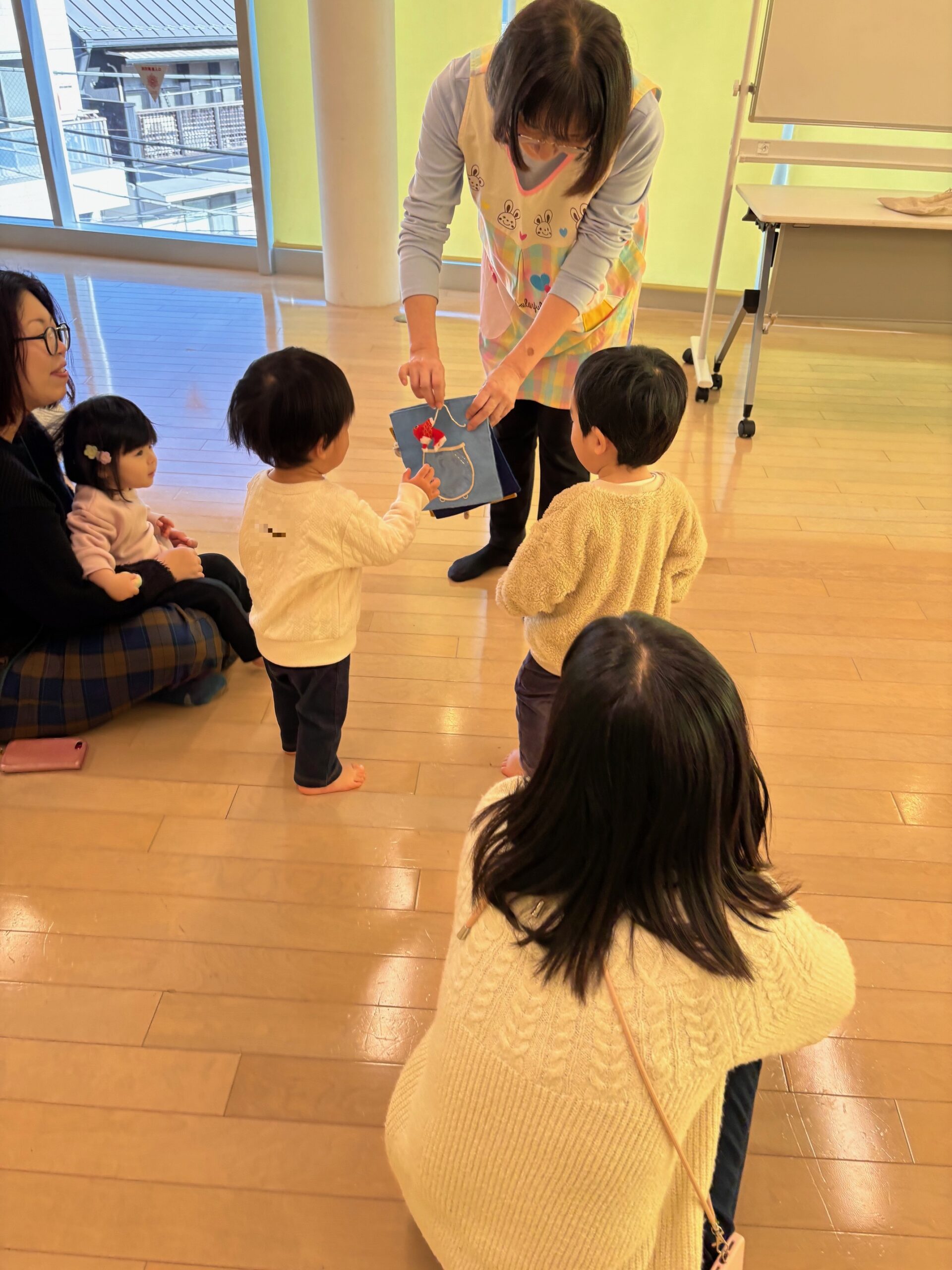ママのお膝の上でだるまさんになってゆらゆらしたり、手を広げて凧になったり、お手玉をおもちに見立ててぺったんしたり、みんなとっても楽しそうでした♪