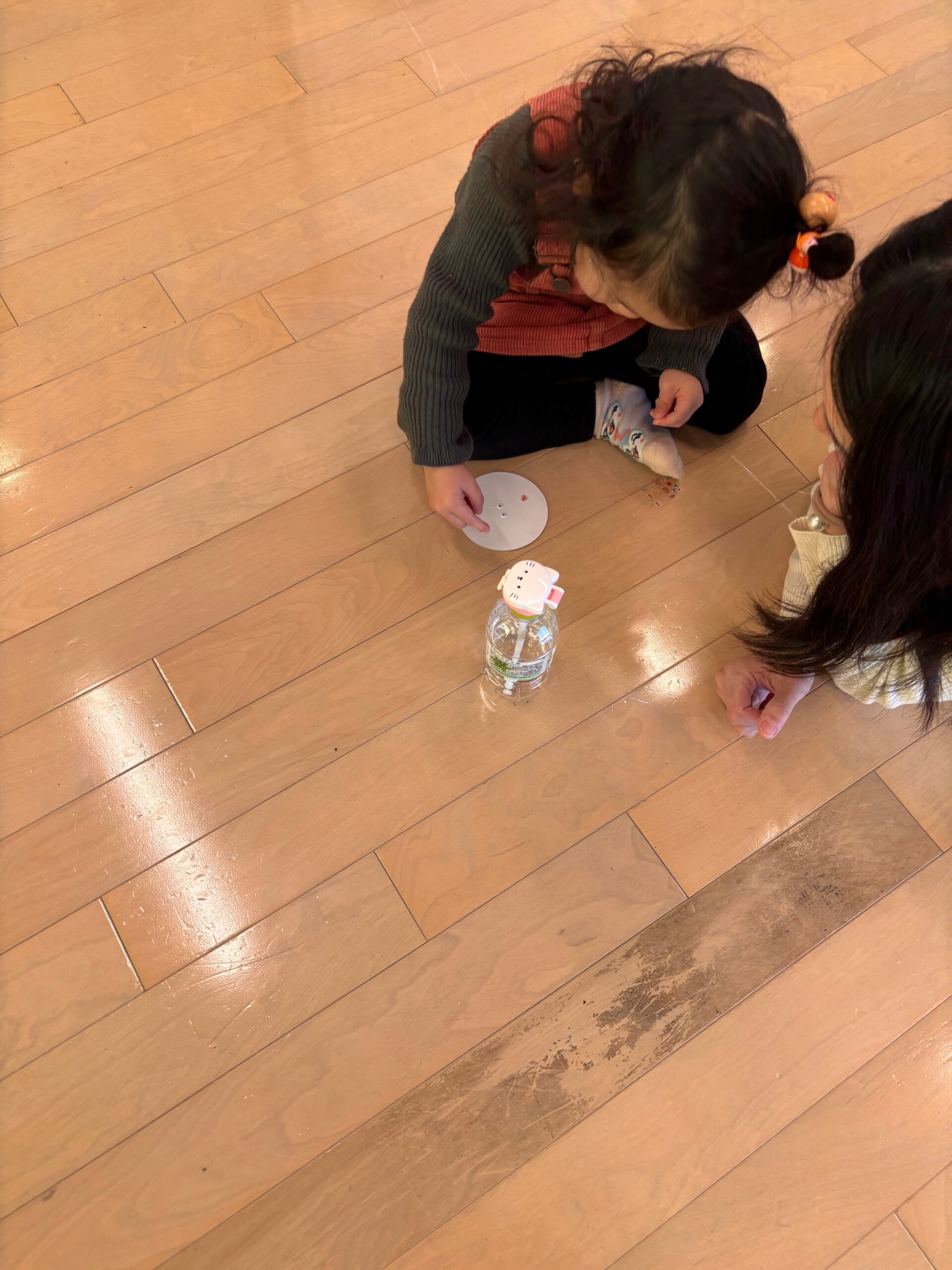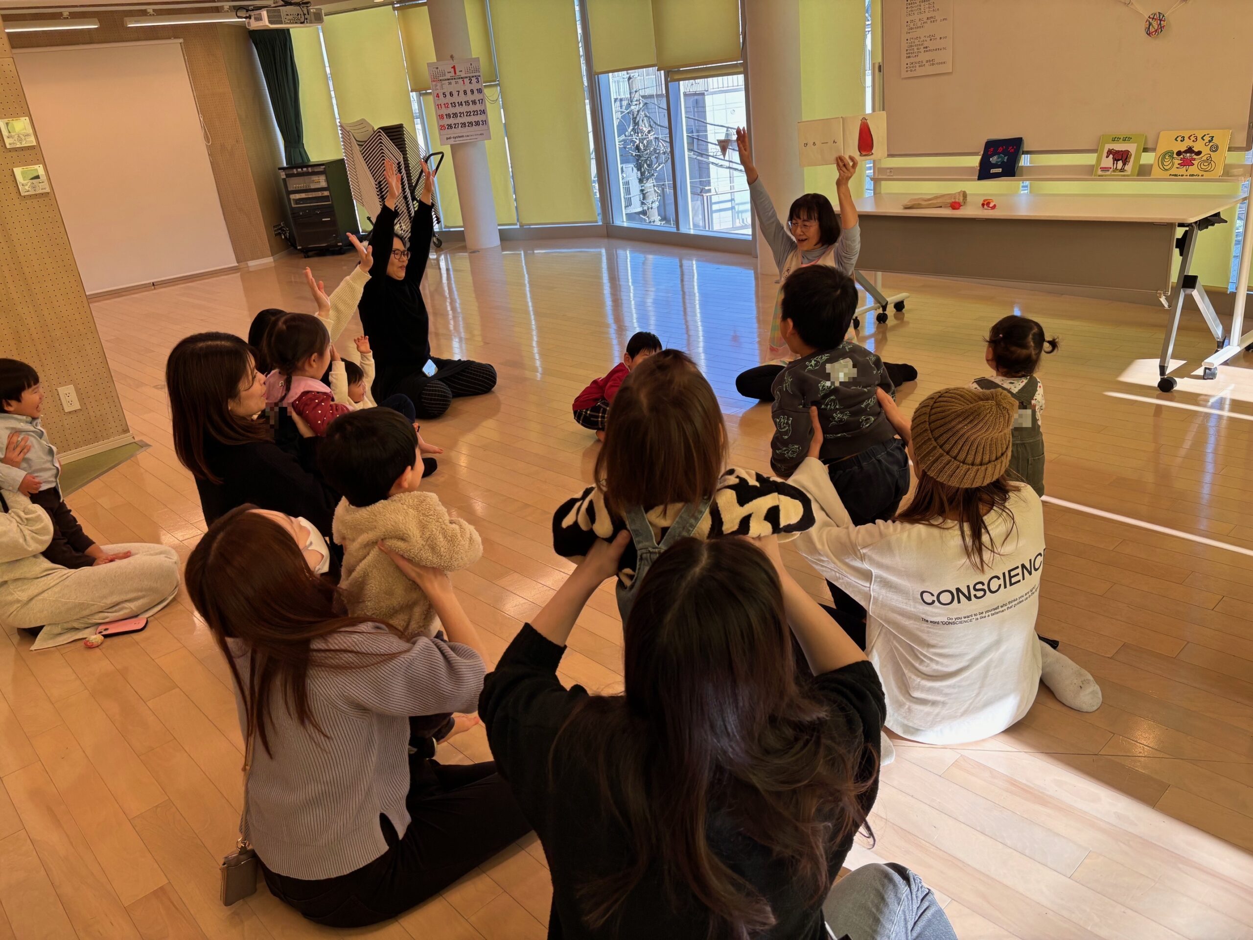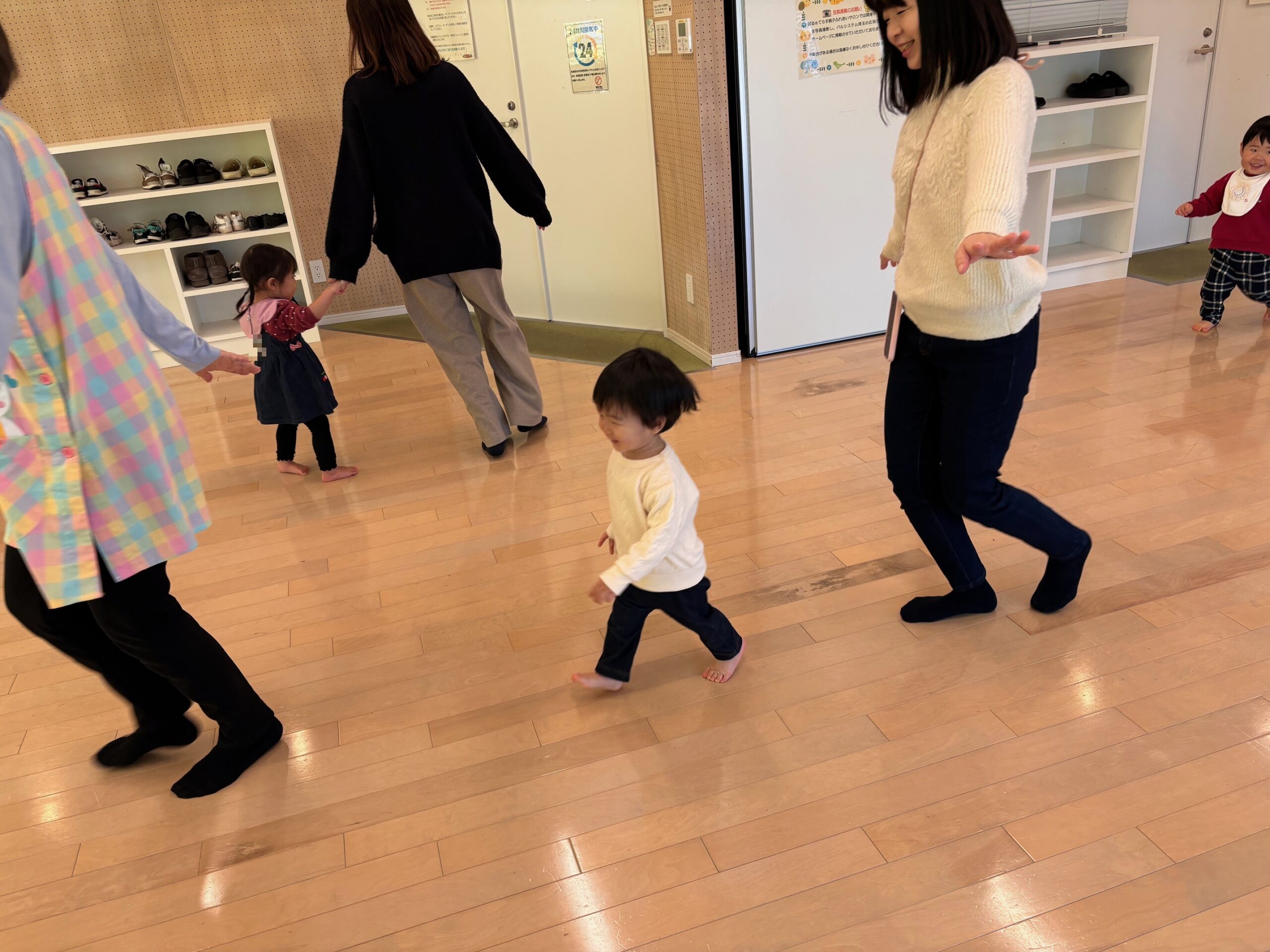 ママのお膝の上でだるまさんになってゆらゆらしたり、手を広げて凧になったり、お手玉をおもちに見立ててぺったんしたり、みんなとっても楽しそうでした♪