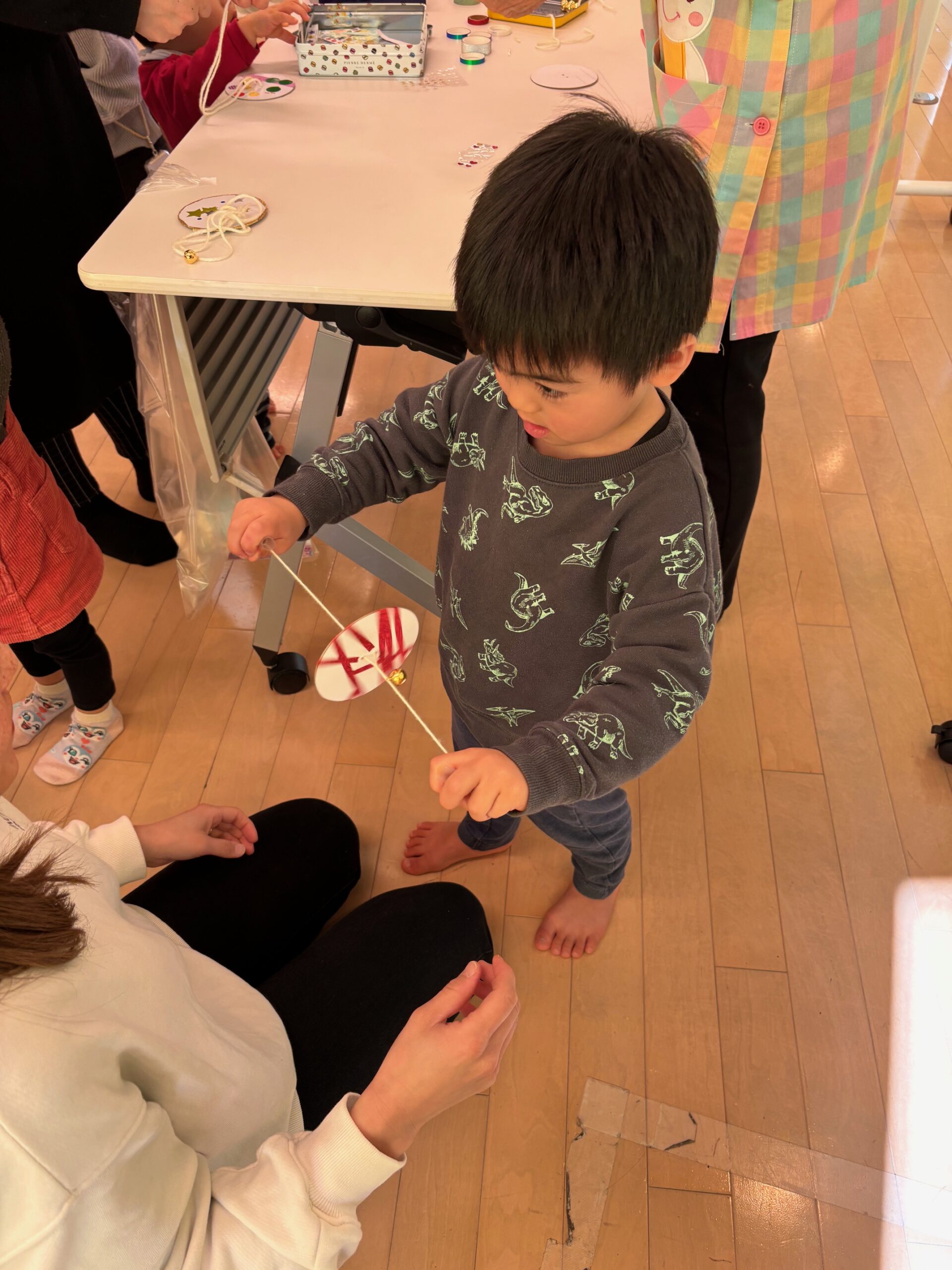1月16日(金)の親子ふれあいサロンは親子ふれあい遊びの講師雲雀さんと、ぶんぶんコマを作って遊びました。