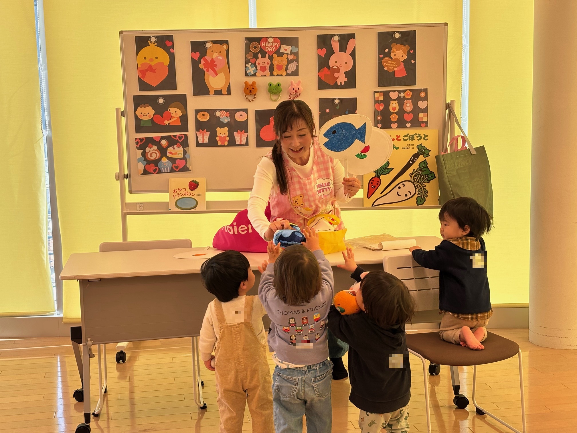 絵本に合わせて食べ物や動物のぬいぐるみが登場。