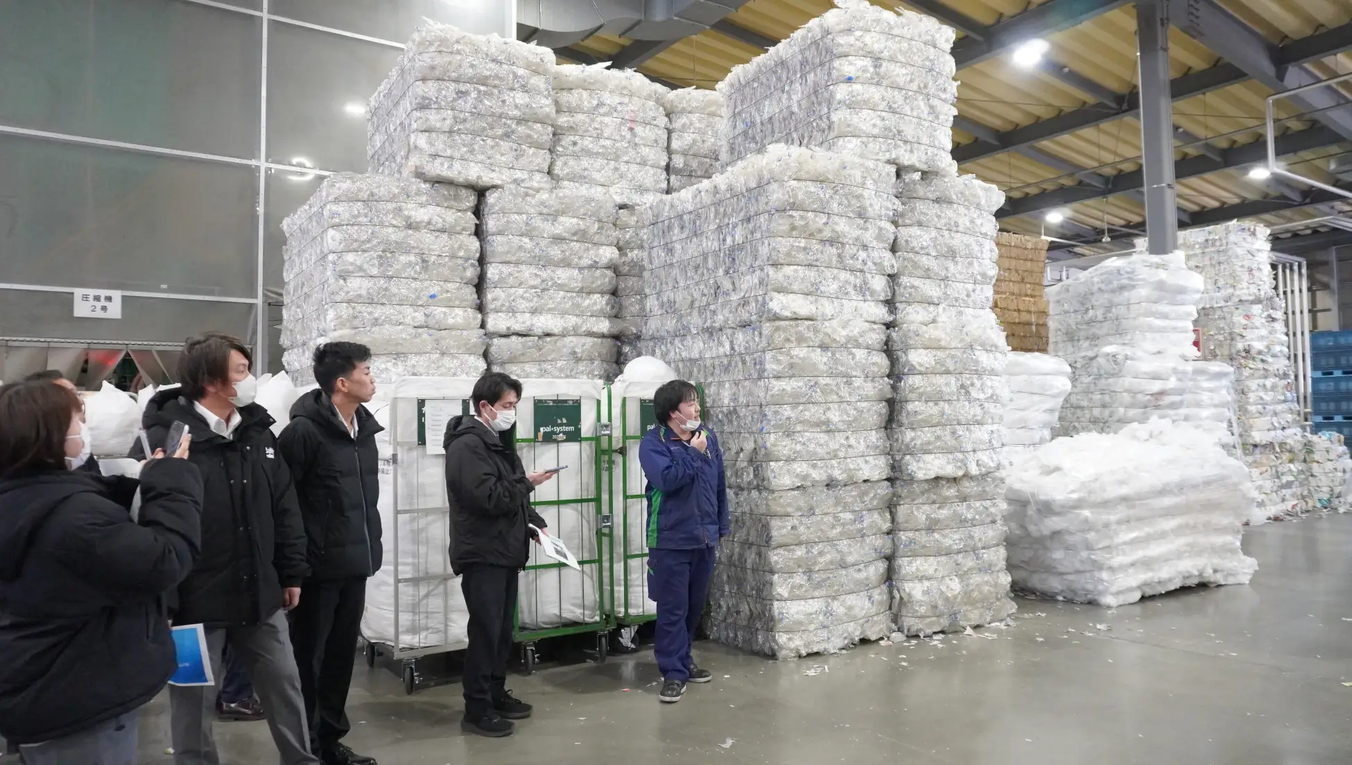 それぞれの資材は回収率確認のため、配送センター及び資材別に重量を計り、2台の圧縮機「ベーラー」で1m×1m×1.8mの塊「ベール」として1日当たり約70本に圧縮されます。プラスチックは素材別に管理しないと資源としての価値が下がるため、異物が混入していないか目視と手作業で確認しながら圧縮機に流します。